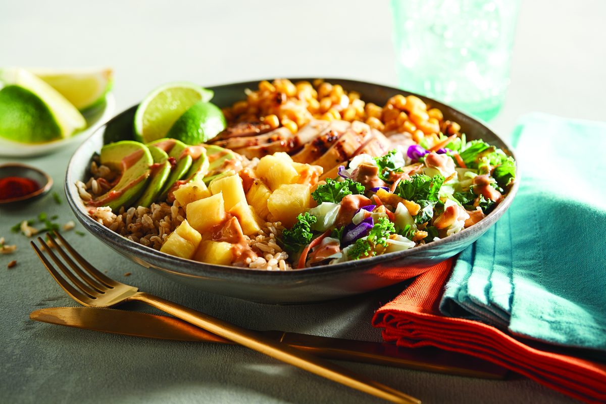 Serve rice in bowls topped with avocado, pineapple, chicken, corn mixture and remaining contents of salad kit drizzled with dressing mixture.