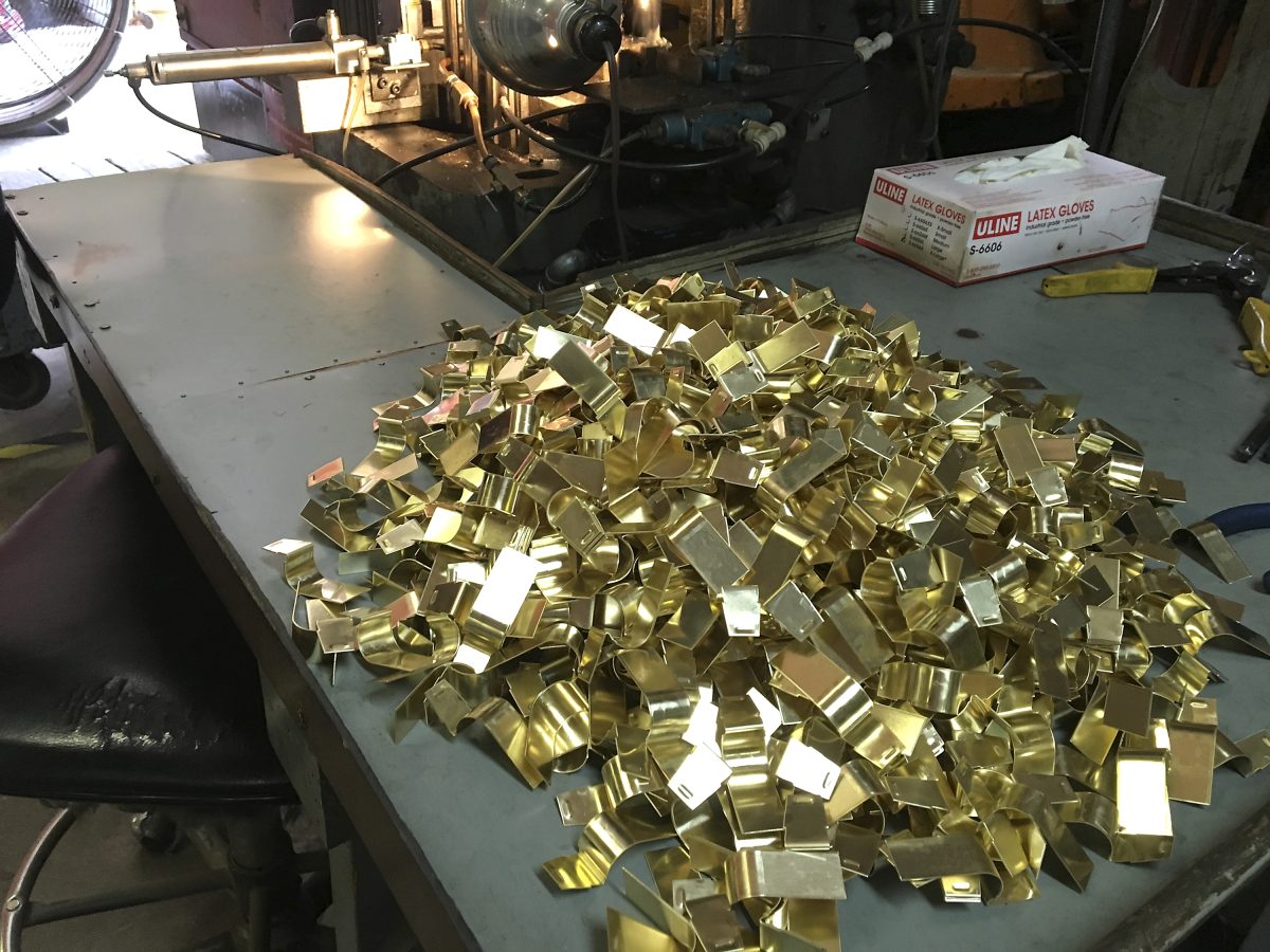 Giesse likened the press to a giant cookie cutter as it stamps the basic whistle shape from coils of brass strips. The machine produces what looks like a rectangle with Mickey Mouse ears, and that shape is soldered in eight separate places.