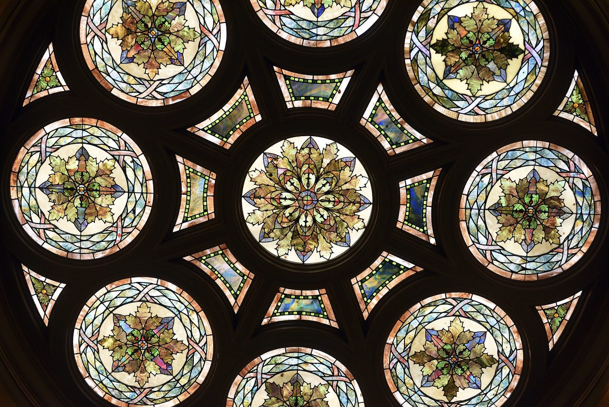Two courtrooms contain stained-glass skylights, and include either mahogany, cherry or oak paneling.