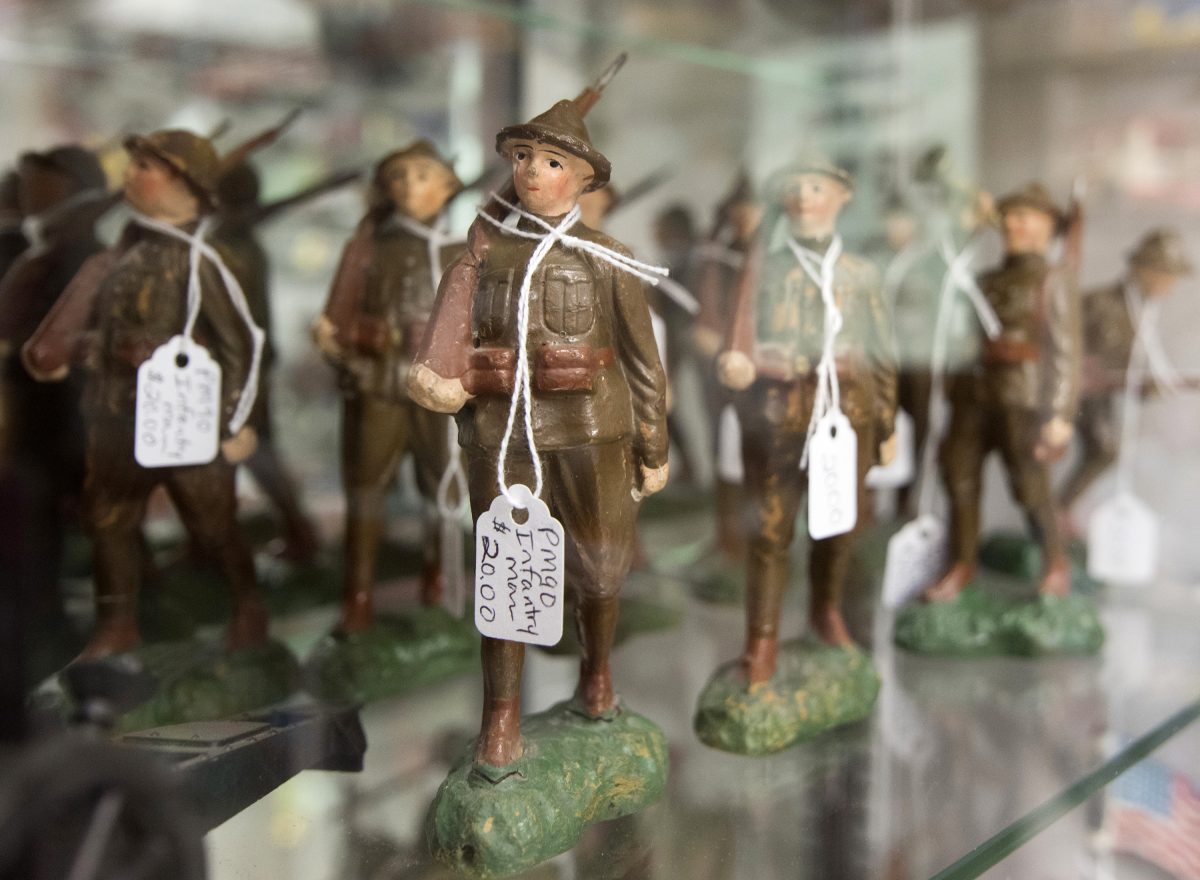 Several antique toy infantrymen fill a shelf at Where the Toys Are.