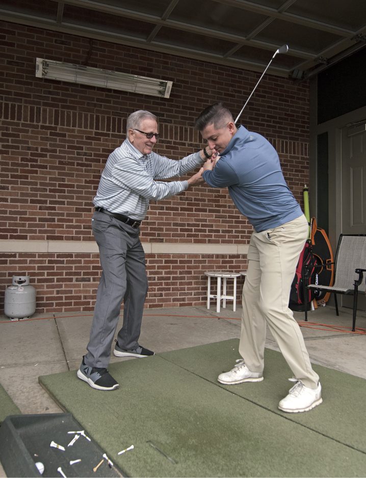 Kurp helps Brad Antal with his swing at Southpointe Golf Club.