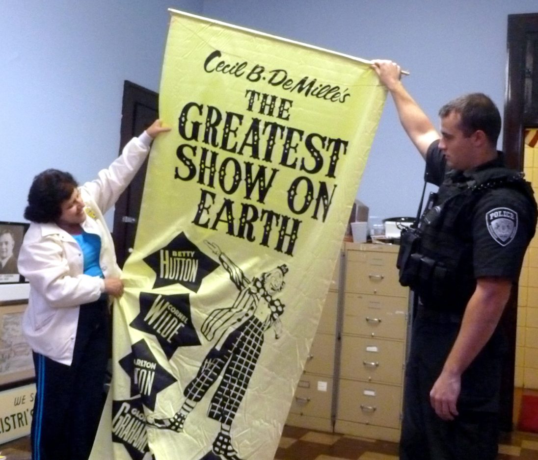 CHARLEROI – A large cloth banner promoting director Cecil B. DeMille’s “The Greatest Show on Earth” when the movie played in 1952 at the Coyle Theater is expected to fetch several hundred dollars when it’s put up for auction, along with other movie-related memorabilia, this week to raise money for the Charleroi building’s restoration.