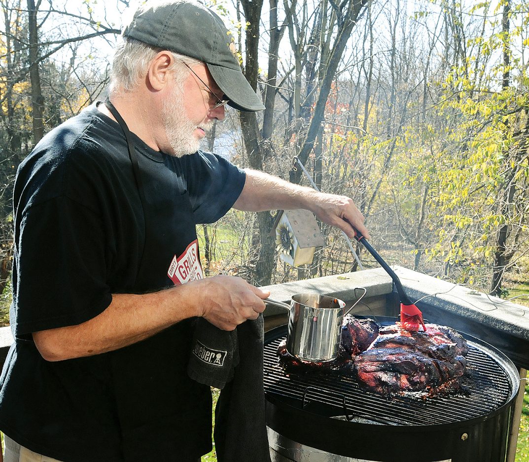 Holy smokes, can Dave Smith grill.Year-round, undaunted by snow, rain or cold weather, Smith hunkers over a fire, barbecuing briskets, ribs, chicken and pork shoulders on the four grills that stand on the backyard deck of his Peters Township home.Smith, 62, an architect and native of St. Louis, Mo., is a Kansas City Barbecue Society-certified judge who travels around the country judging barbecue competitions. He knows just about everything a carnivore needs to know about cooking meat.”I’ve always grilled. I like to eat, and I like barbecue,” said Smith. “The whole concept of barbecue has grown in recent years. You can’t watch the Food Network or the Cooking Channel without finding a barbecue show.”And you can’t peek in Smith’s kitchen cabinets or open his refrigerator without running across all things barbecue: rubs and spices, grilling tools, recipe books and magazines.On Nov.1, his chili took first place in The Best Chili In Peters Township Chili Cook-off, sponsored by the Peters Township Public Library cooking club.Smith has appeared on QED Cooks on WQED, where he whipped up his specialty cole slaw – Lexington Red Slaw made with barbecue sauce (see recipe) – for host Chris Fennimore, and his barbecue recipes have been published in a variety of cookbooks.So what’s the secret to great barbecue?”It’s all about keeping it low and slow,” said Smith. “You don’t want the fire getting above 250 or 275 degrees. Then it just cooks too fast, particularly the brisket and meats that have a lot of fat. The trick is the air control. You have to control the amount of air through the vents to keep the fire low. You’ve got to cook it slow, and cook it a long time. It’s a skill you develop. You’ve got to know your pit, and you’ve got to know your cooker.”Smith, who spent his architectural career renovating upscale hotels and moved to the Pittsburgh area 31 years ago after visiting the city on a business trip, was born and raised in St. Louis – selected by Kingsford Co. in 2011 as America’s top grilling city.In many ways, Smith’s barbecue is like good architecture, where form follows function: his meats taste great, but they also are creative and visually delightful. The star attraction of barbecue is the meat, and Smith gets his at Weiss Meats in Pittsburgh. His arsenal of grills includes smokers and a kettle grill (you won’t find a gas grill), and he relies on lump charcoal, hickory wood, cherry wood and apple wood that he retrieves from Simmons Farm.Smith enjoys eating barbecue and entertains often, but one of the things he most likes is judging competitions. His son and his son-in-law both are KCBS-certified judges, and the three recently judged a competition in Maryland together. It’s a serious business. Competitive barbecue teams – armed with clever names like Glazed and Confused, Church of Swinetology and Squeal of Approval – work hard to win competitions, where prize money at some of the premiere events like the American Royal BBQ Championship reaches $100,000. “It’s a lot of fun. You judge chicken, then ribs, then pulled pork, then brisket. There will be five to six plates, and you take a portion of each one and you judge them. You’re only supposed to take a couple of bites, but once in a while you’ll hit something that’s so fantastic, you eat more than you really should,” said Smith.Which is quite a feat, because really, Smith doesn’t have to go any farther than his backyard grill for fantastic barbecue.***********Lexington Red BBQ Slaw (modified by Dave Smith)3/4 cup mayonnaise3/4 cup vinegar-based red BBQ sauce (like “Bone Suckin”)2 Tbsp brown sugar1 Tbsp cider vinegar1 tsp celery salt3 cloves garlic, chopped fine1 bag cole slaw mix1 cup onion, chopped1 cup red bell pepper, chopped2 hard-boiled eggs, choppedPreparation time: 1 hour, 30 minutesThoroughly mix the first six ingredients. Toss the next four ingredients, then pour the dressing over the slaw mix and toss well. Chill for at least an hour. (Feel free to add a little more garlic and a little sweet/hot sauce like Tiger Sauce.) Smith said he usually makes the dressing the night before to allow the flavors to “blend.” Then toss with the other ingredients just before serving.