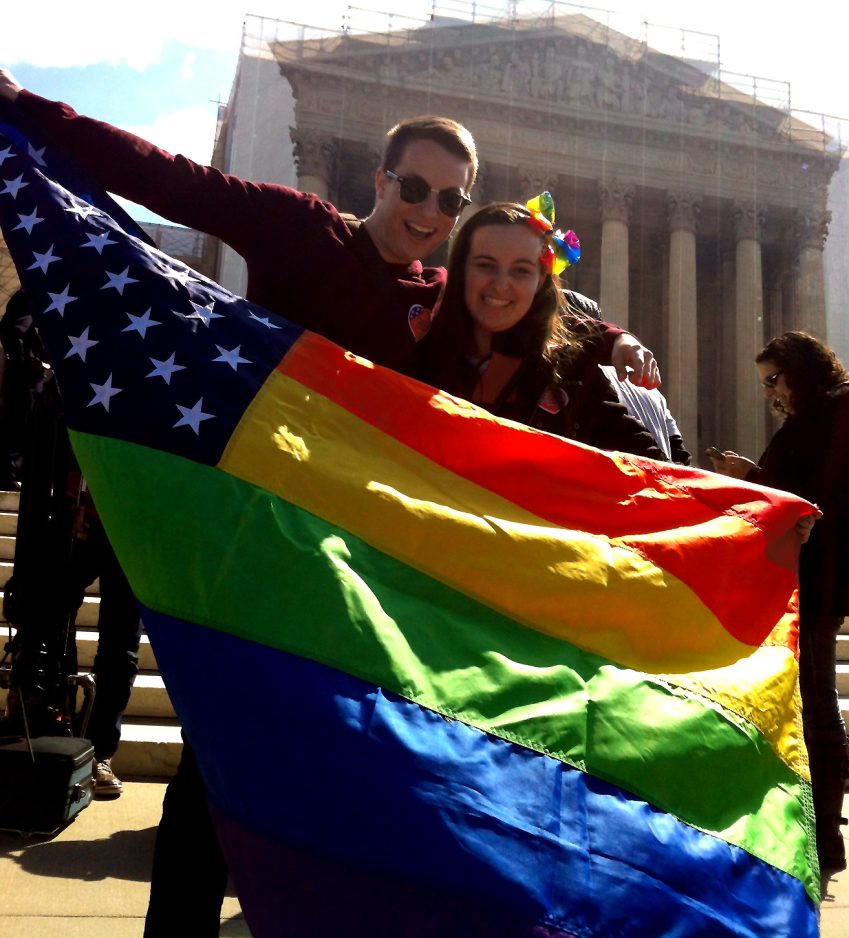 Around him, same-sex marriage supporters passed out American flags and held up homemade signs that read “God loves us all equally” and “Love is love.”