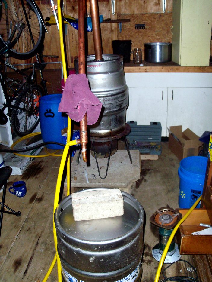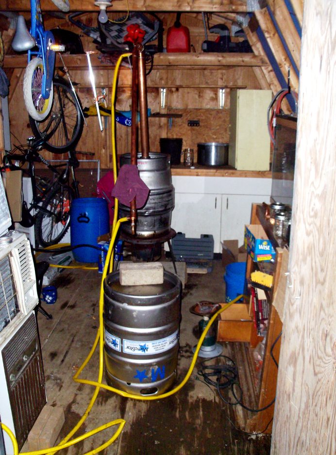 Police said they could see two 15.5-gallon beer kegs that were connected by copper lines. A propane tank with two burners was under one of the kegs.