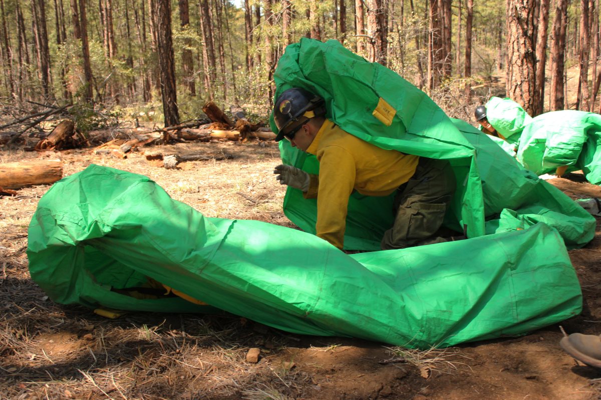 When there is no way out, firefighters are supposed to step into them, lie face down on the ground and pull the fire-resistant fabric completely over themselves. The shelter is designed to reflect heat and trap cool breathable air inside for a few minutes while a wildfire burns over a person.