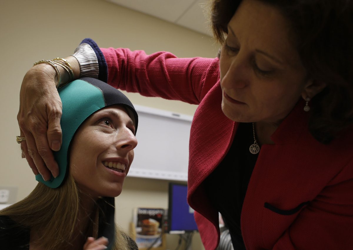Lipton was among 20 U.S. patients who pilot-tested the DigniCap in 2011, most of whom kept more than half of their hair. Lipton’s thinned quite a bit at the crown, where the cap didn’t fit snugly. But because her bangs and surrounding hair remained, the mother of two covered the thinning with a headband, not a wig. The side effect: Pain and a headache as the cold set in.