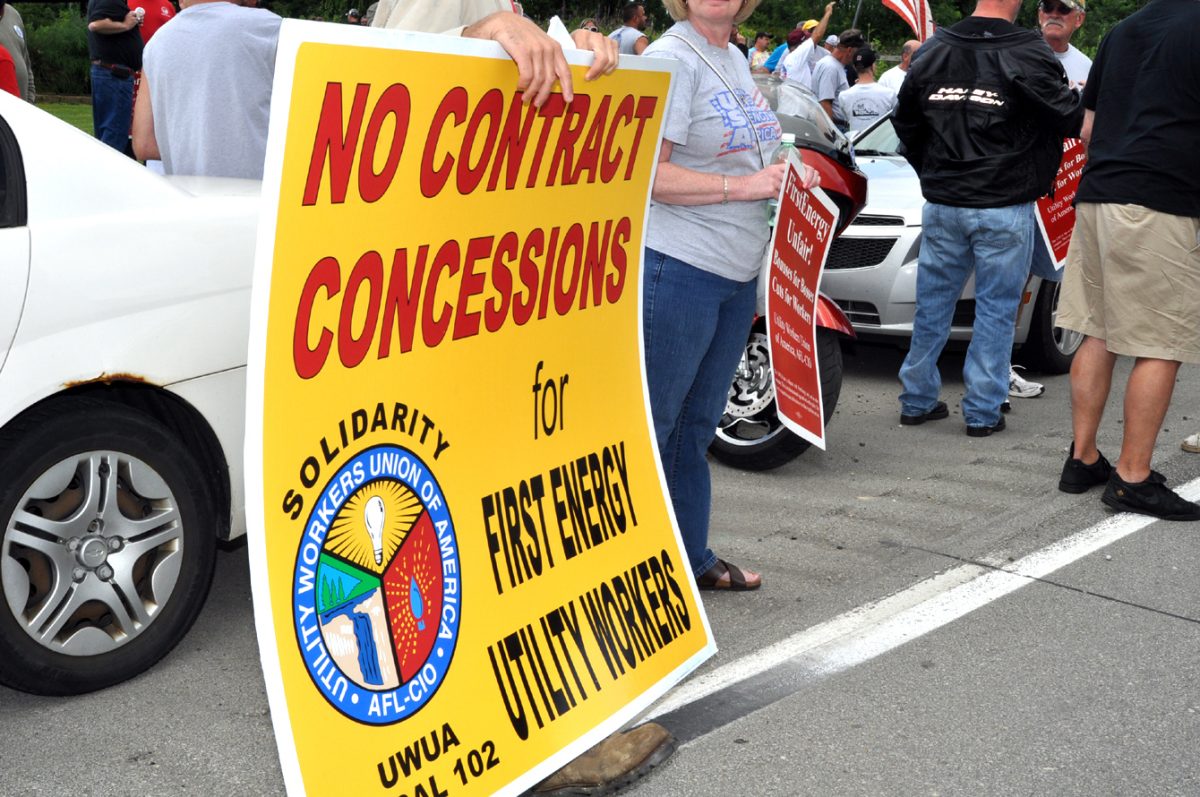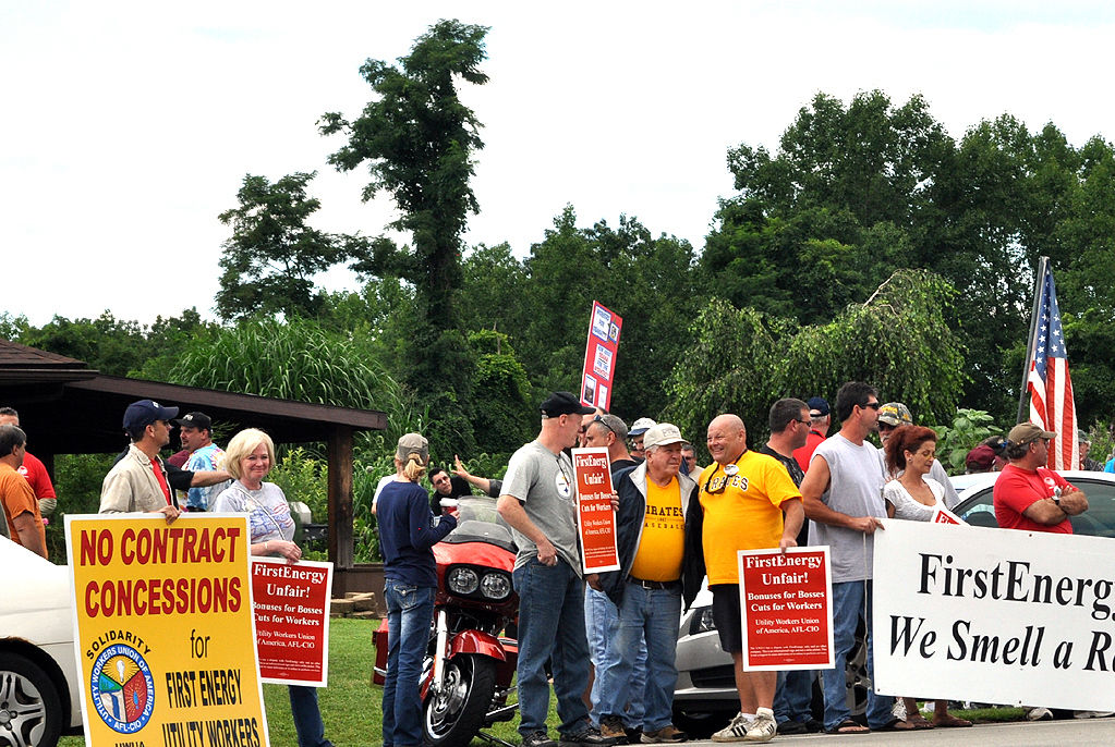 Holding a sign reading, ‘First Energy Unfair, bonuses for bosses cuts for workers,’ Robert Szerszen, who has worked at the Mitchell plant for 31 years, said none of the contract issues were settled.