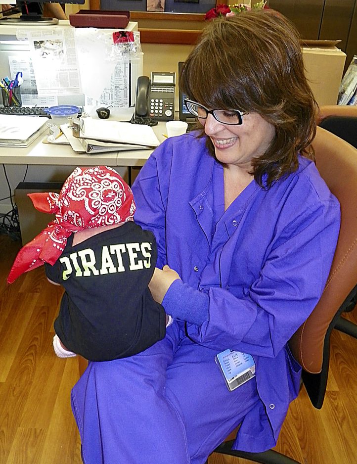 Linda McIntyre, director of Women and Childcare Services at St. Clair, is hoping the Pirates continue to win so the Pirate-themed baby gear can continue.