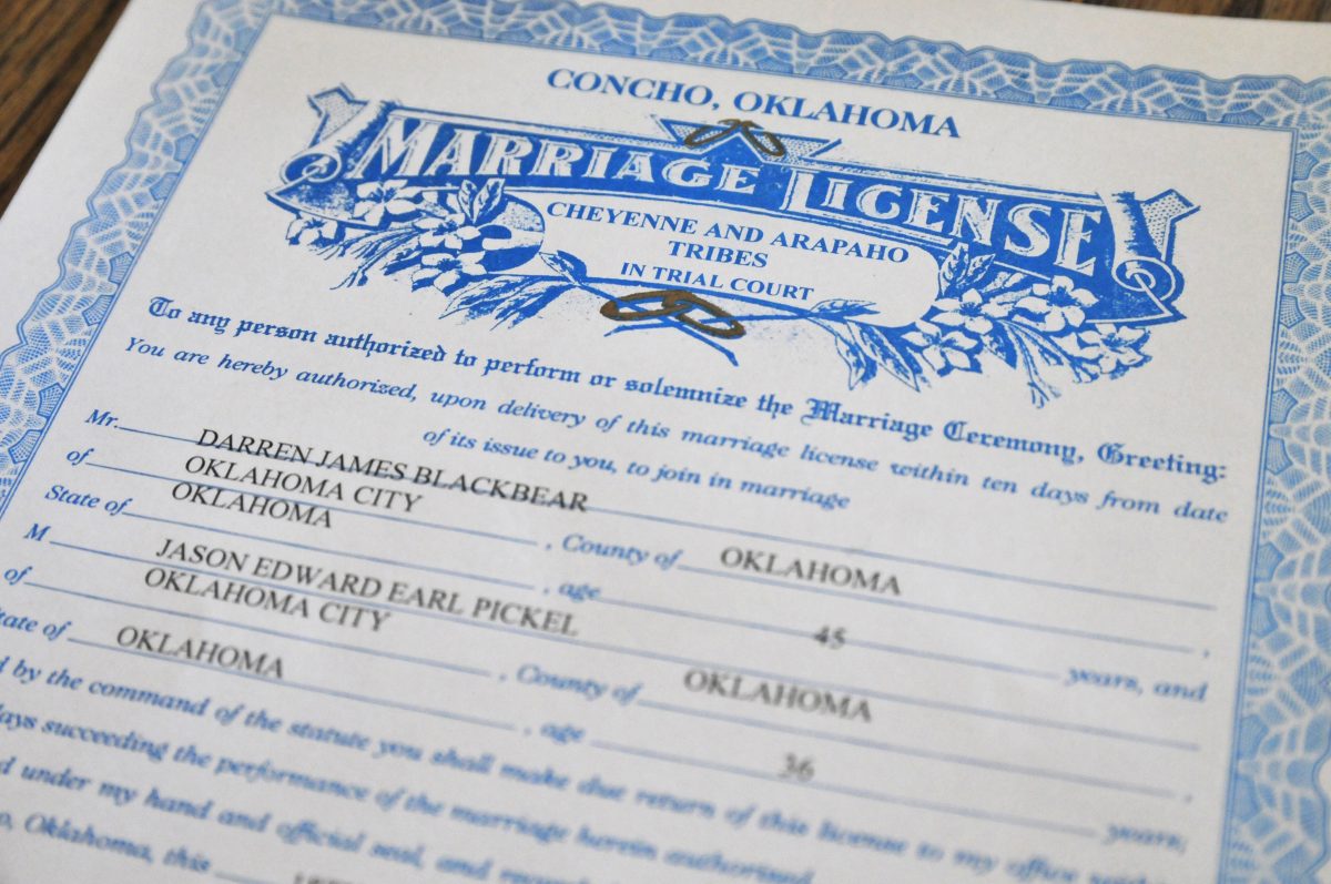 Like all federally recognized tribes, the Cheyenne Arapaho can approve laws for its land and members. Its code regarding marriage doesn’t address gender, referring to the parties simply as “Indians,” and requires that one person be a member of the tribe and reside within its jurisdiction.