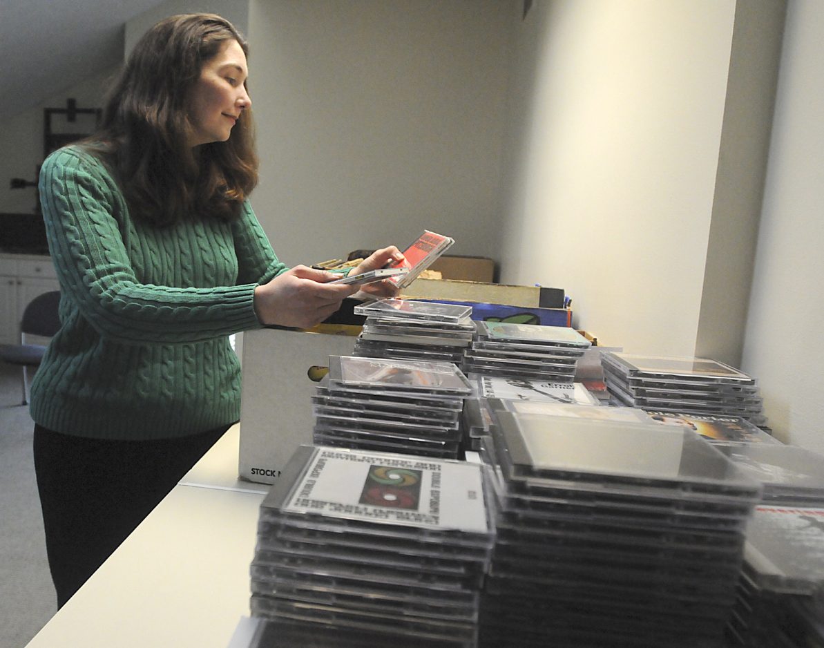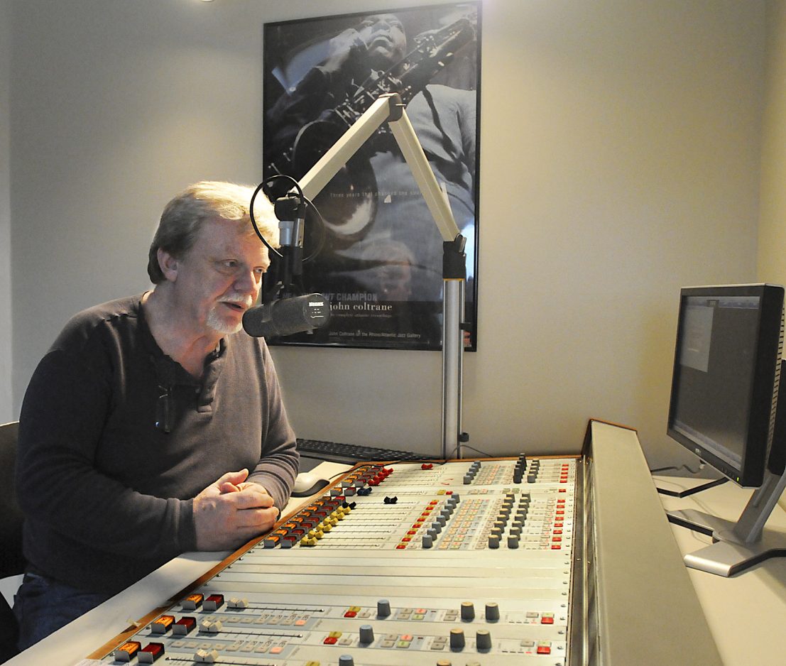 The saxophone deity’s image is framed in a poster on a wall next to a control board, where announcers work and jazz flows forth on a 24-hour basis, with boxes of old vinyl records and compact discs sitting nearby.