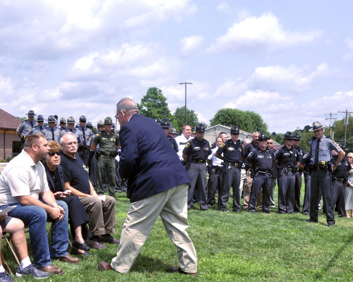 MT. MORRIS – There was a sea of blue in Greene County Wednesday afternoon as law enforcement officers from across West Virginia joined with their brethren in Pennsylvania at the dedication of the Sgt. Michael Todd May Interchange at Mt. Morris.