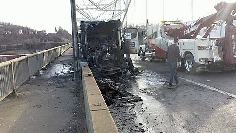 Tractor-trailer ignites on bridge