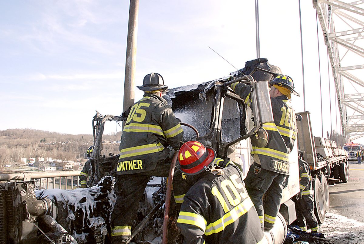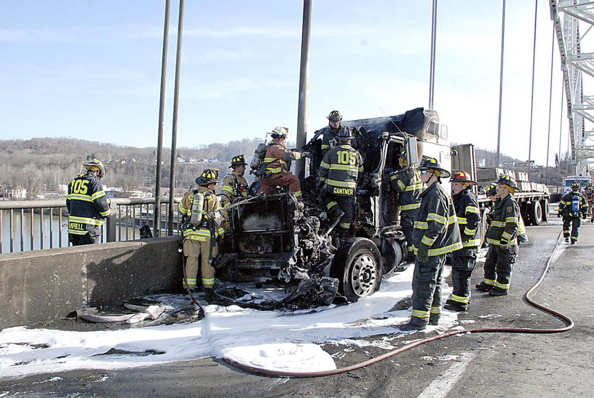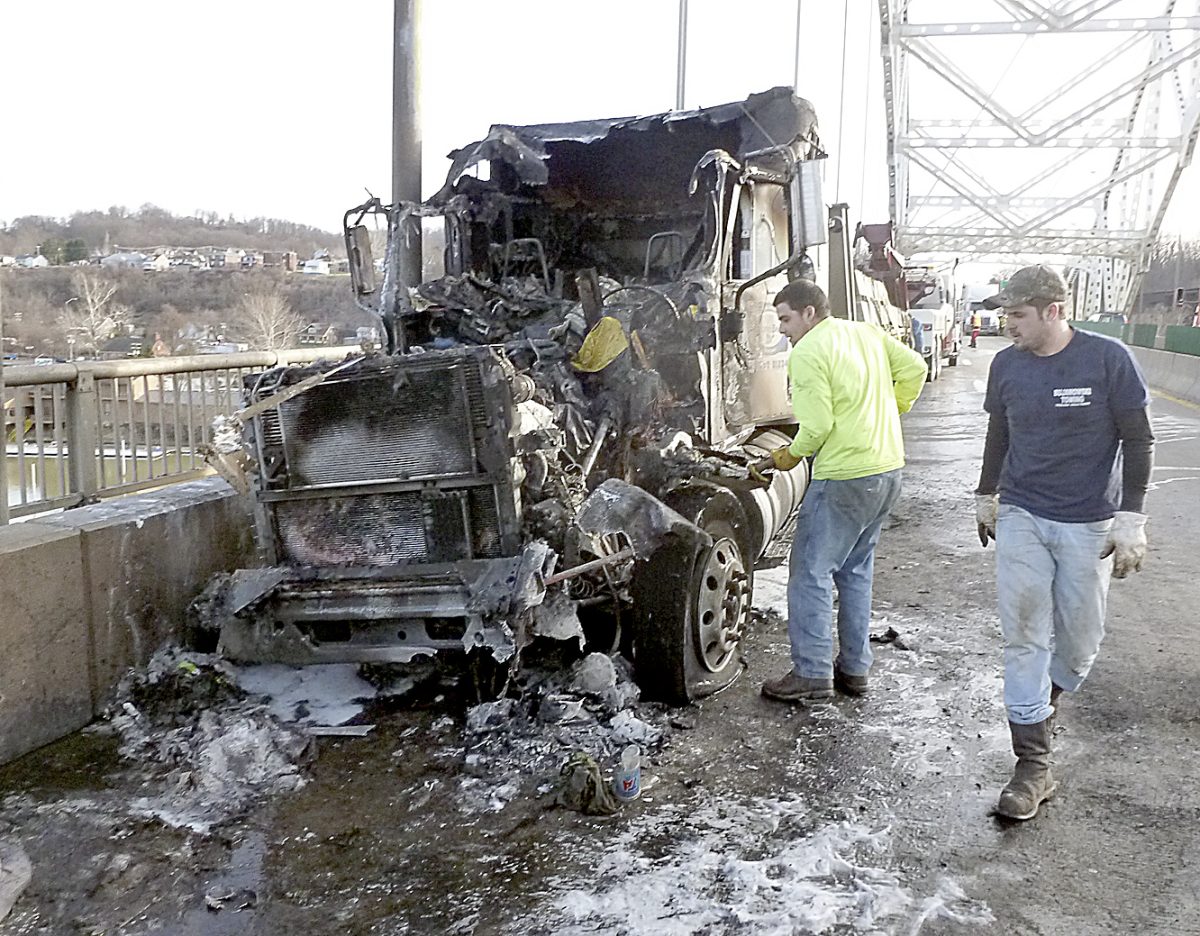 The vehicle, driven by Mark Heidenreich, 52, of Indiana state, blew a tire about 5 p.m. and crashed into the barrier along the pedestrian walkway on the Speers-Belle Vernon Bridge over the Monongahela River. The tractor-trailer was hauling concrete slabs on a flatbed.