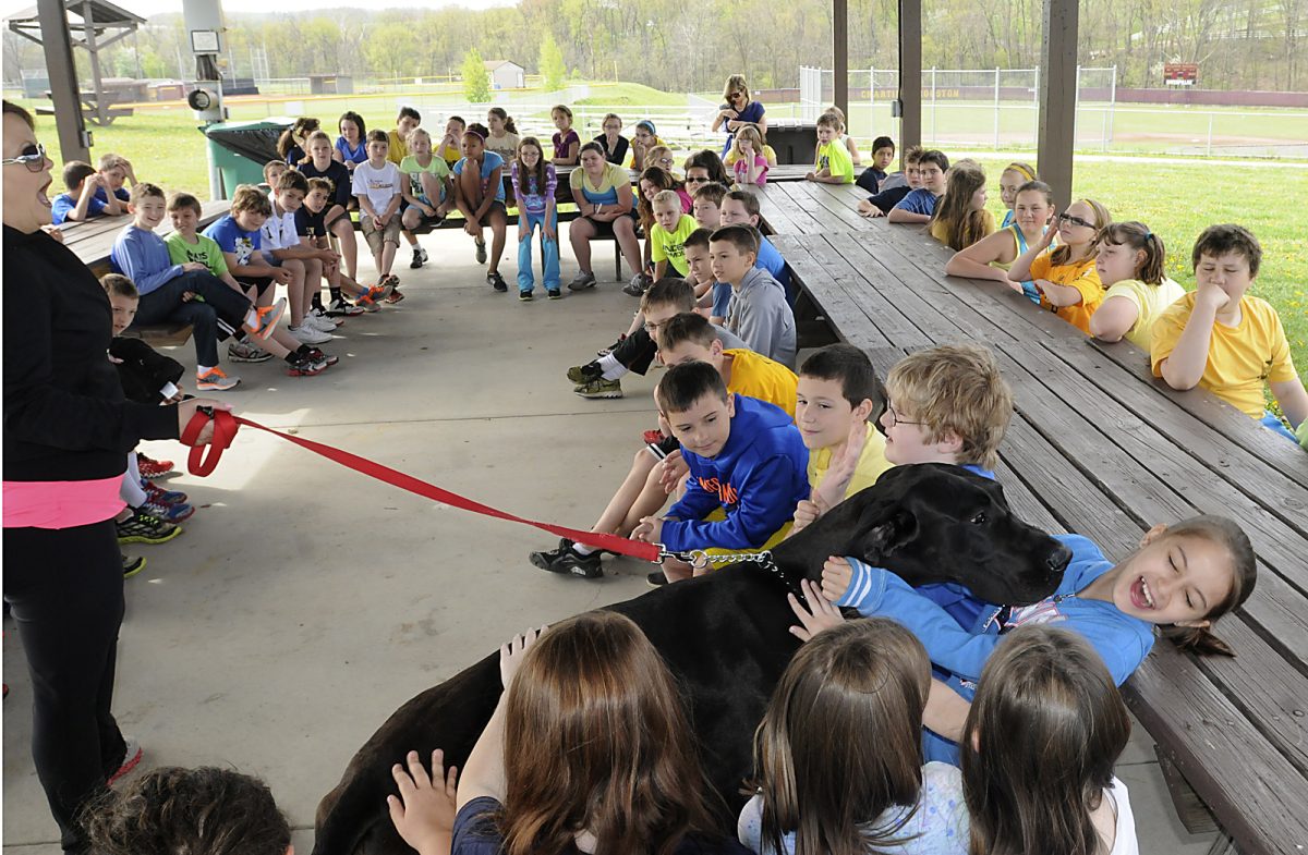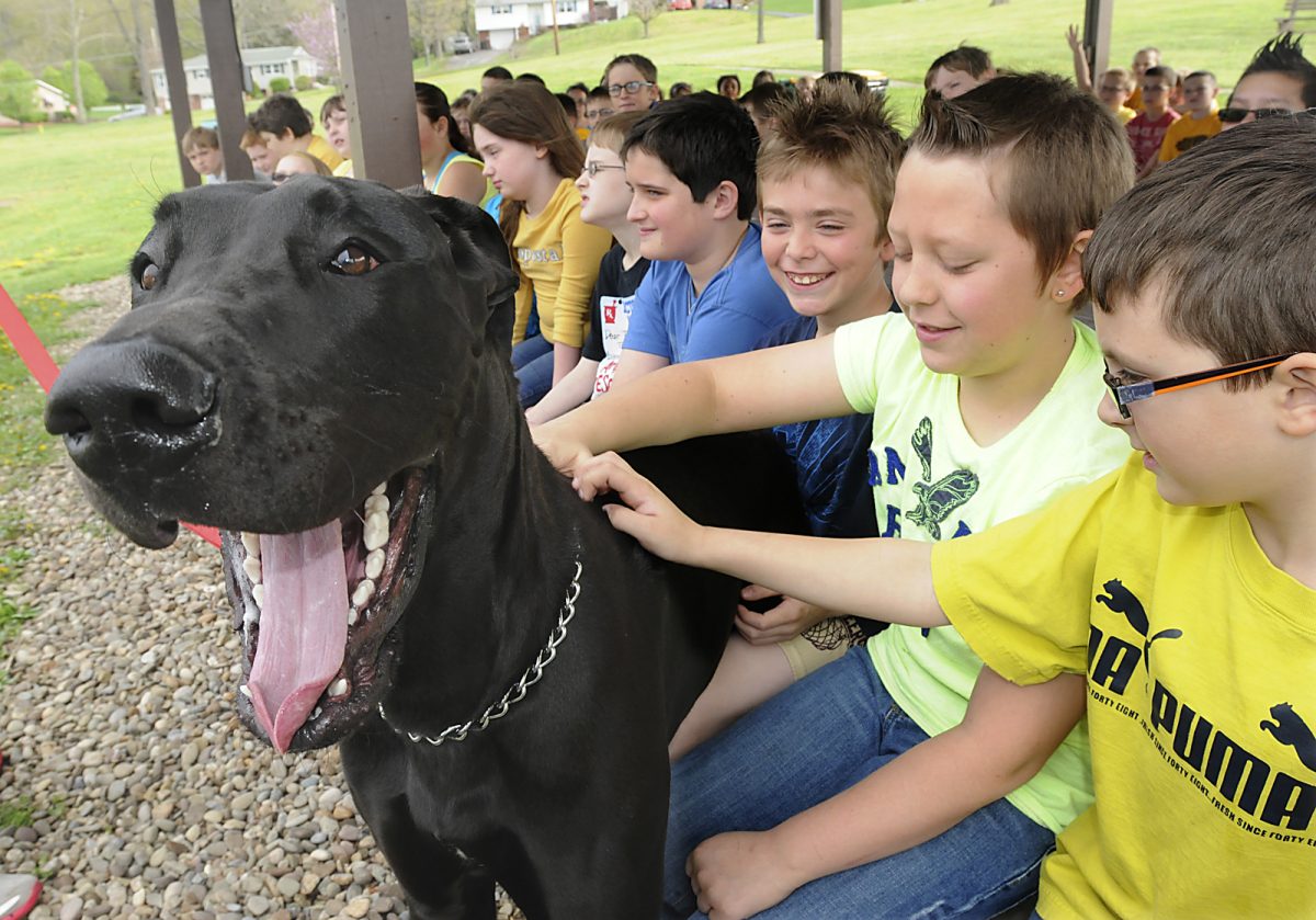 George, a Great Dane, visited fourth-grade classes Thursday at Allison Park Elementary to help the Chartiers-Houston students celebrate Pennsylvania Pride Week.