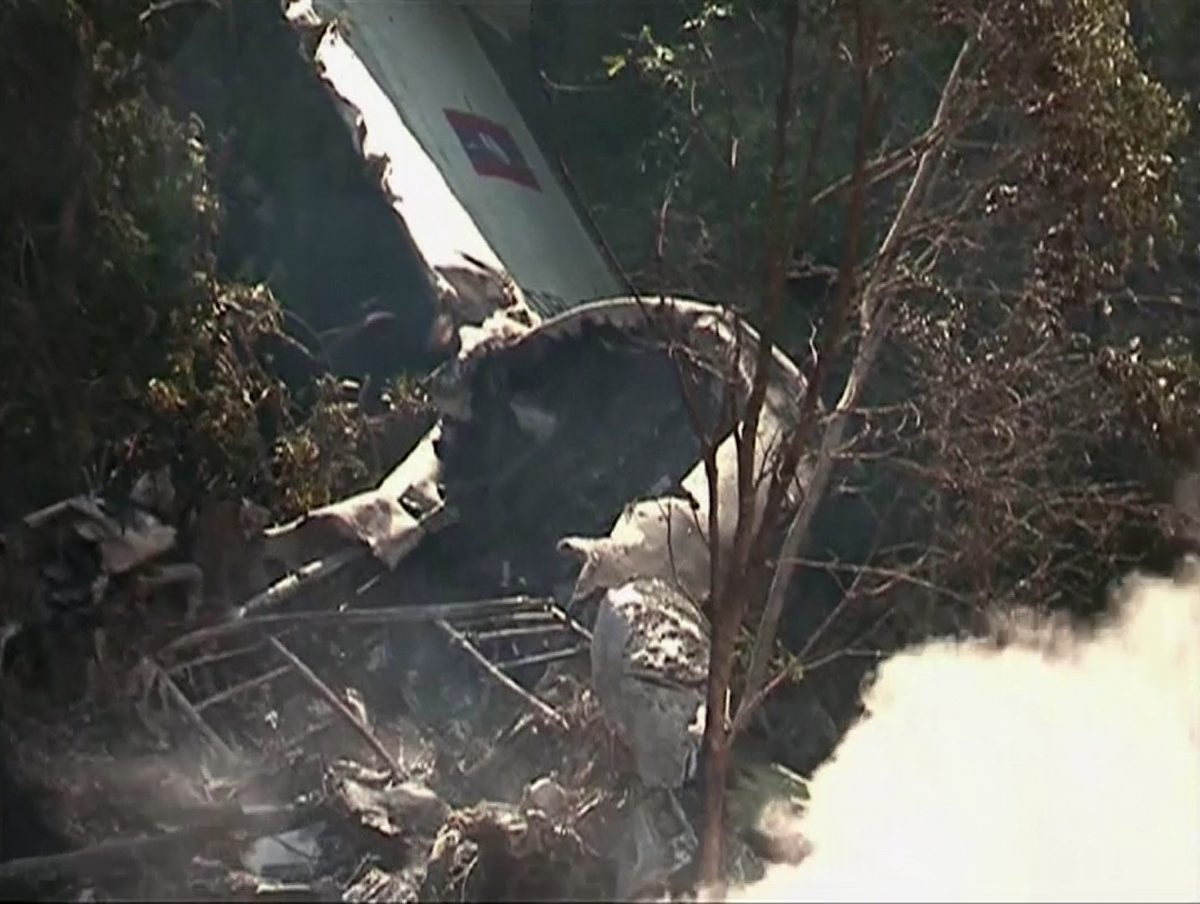 This image taken from video provided by Lao National TV, shows the wreckage of a Lao air force plane which crashed in a forested area of Xiangkhoung province, Laos Saturday.
