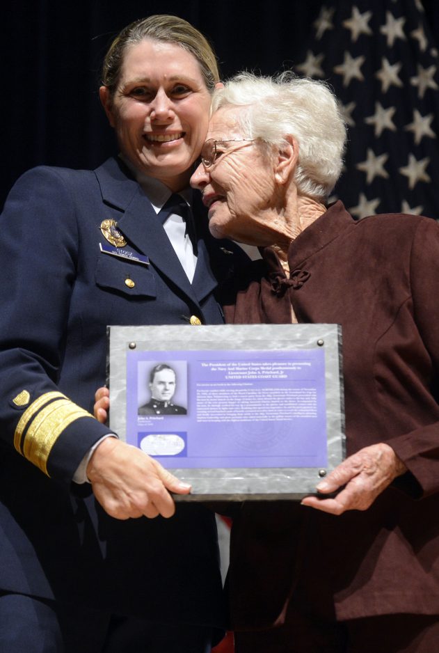 “John was a very friendly, caring person,” said his sister, 91-year-old Nancy Pritchard Morgan, who received an ovation from cadets in dress blue uniforms at the ceremony. “He loved his family, he loved the Coast Guard, he loved flying, he loved life. His actions on the Greenland ice cap read like his whole life.”