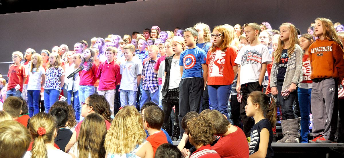 Between those speaking, the more than 800 students in kindergarten through fifth grade performed patriotic songs by grade level, educated the audience on the folds of the flag, and waved hand-held U.S. flags.