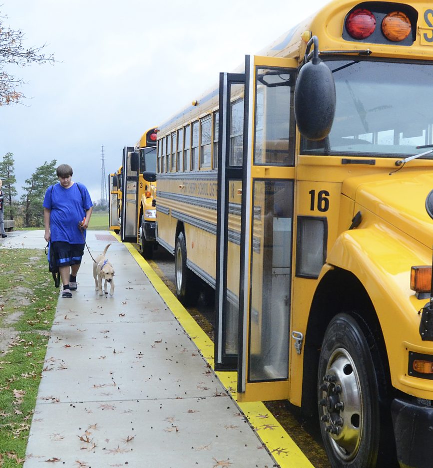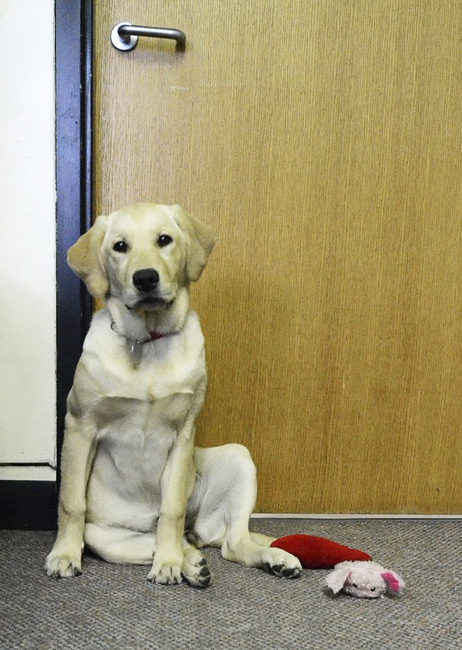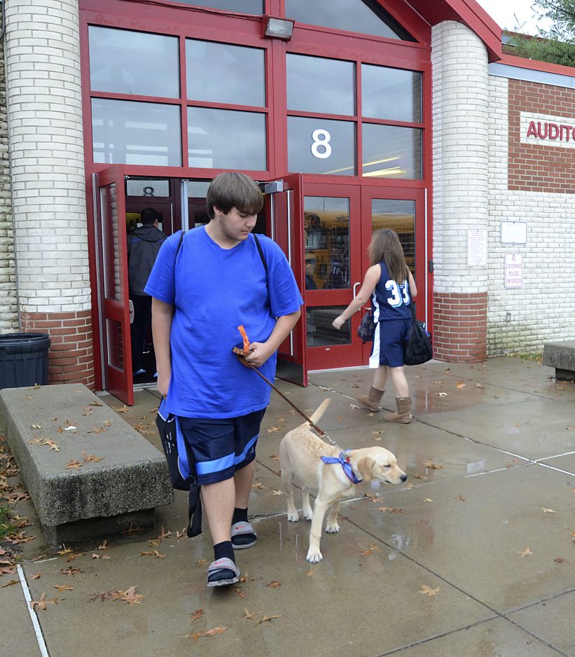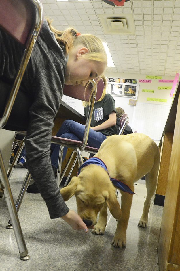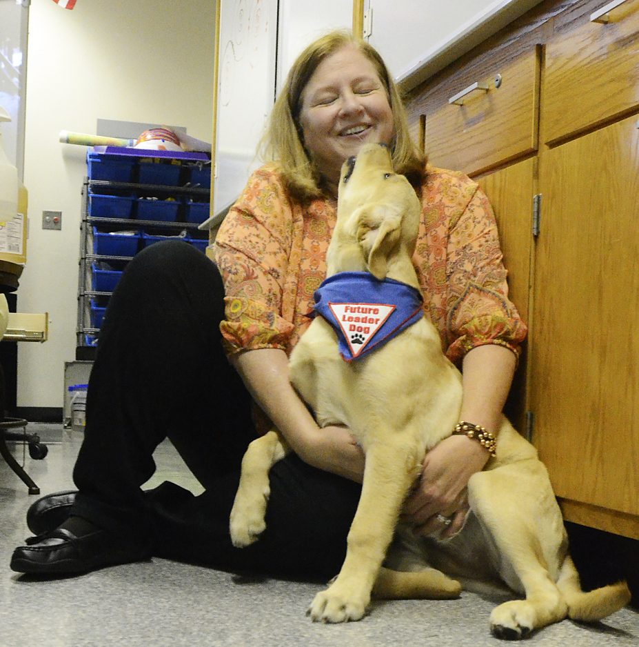 Briggs’ current puppy, a lab and golden retriever mix, stays in her classroom during the day. After school, it heads home with student Brendan Warner.