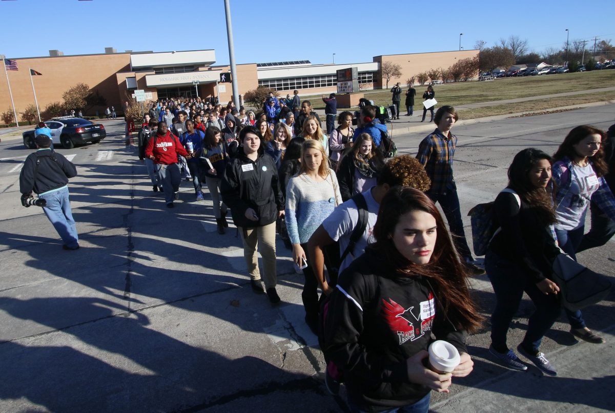 During Monday’s protest, hundreds of students poured out of the school during the second period to join about 300 protesters already lining the sidewalk.