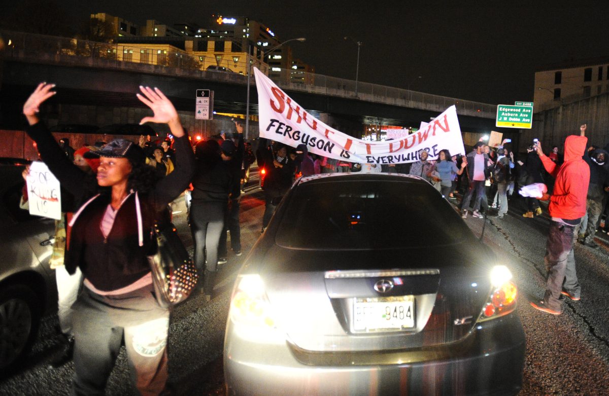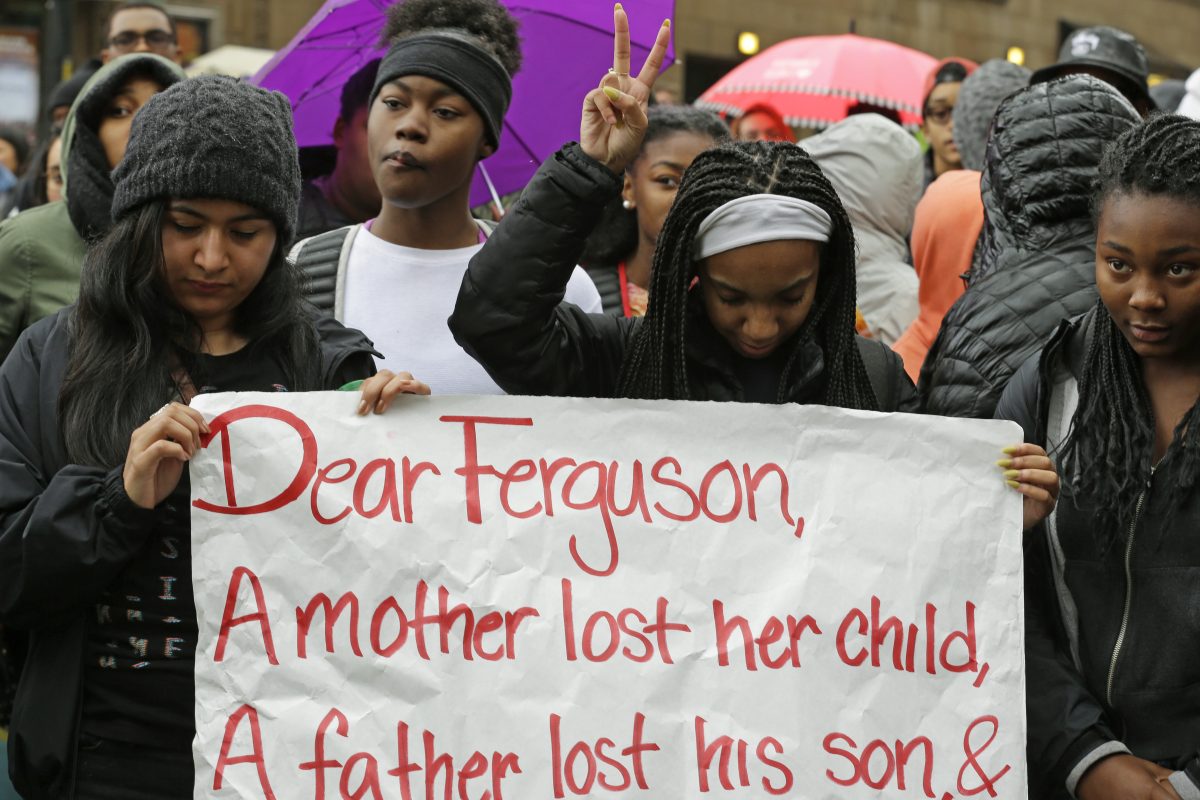 Protests continued during the day on Tuesday. In Clayton, where the grand jury met, clergy members and others blocked morning traffic for several hours. In downtown St. Louis, where demonstrators swarmed the steps of a federal courthouse and stopped traffic, at least four people were arrested.
