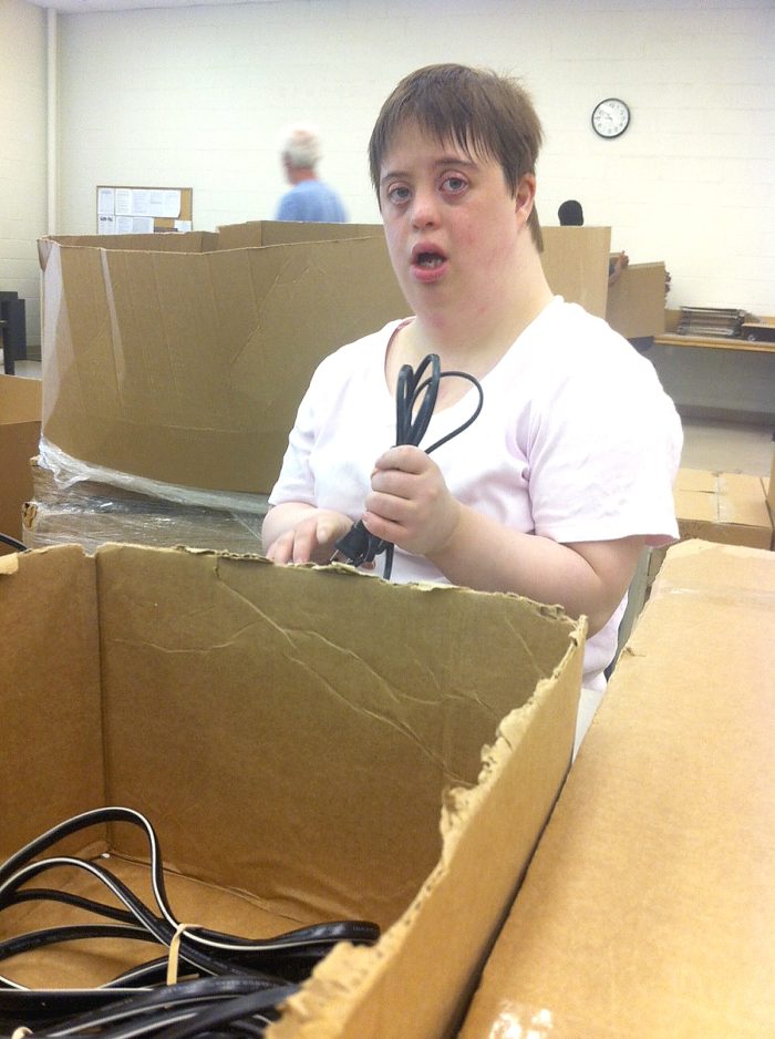 Jennifer, a 27-year-old with Down syndrome, has been bagging shoe-polish kits and wrapping electrical cords, among other jobs, for a biweekly paycheck of $55 to $65 at Handi-Crafters for six years. The average hourly pay there is $2.37, according to U.S. Department of Labor records.