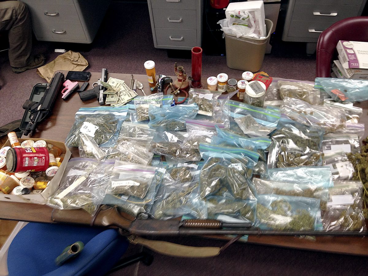 Detectives said 103 bags of suspected marijuana packaged for sale, marijuana seeds and paraphernalia were found inside the home, along with four guns. Large amounts of harvested marijuana were found in a trailer on the property.