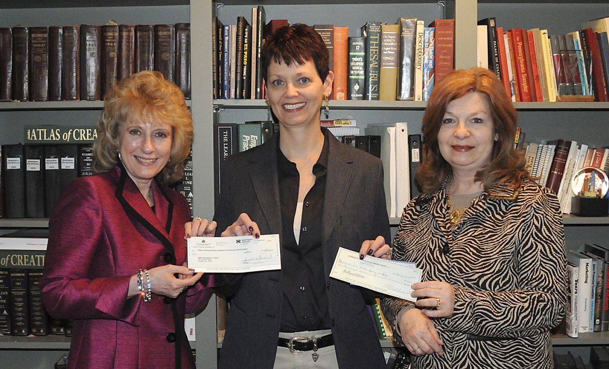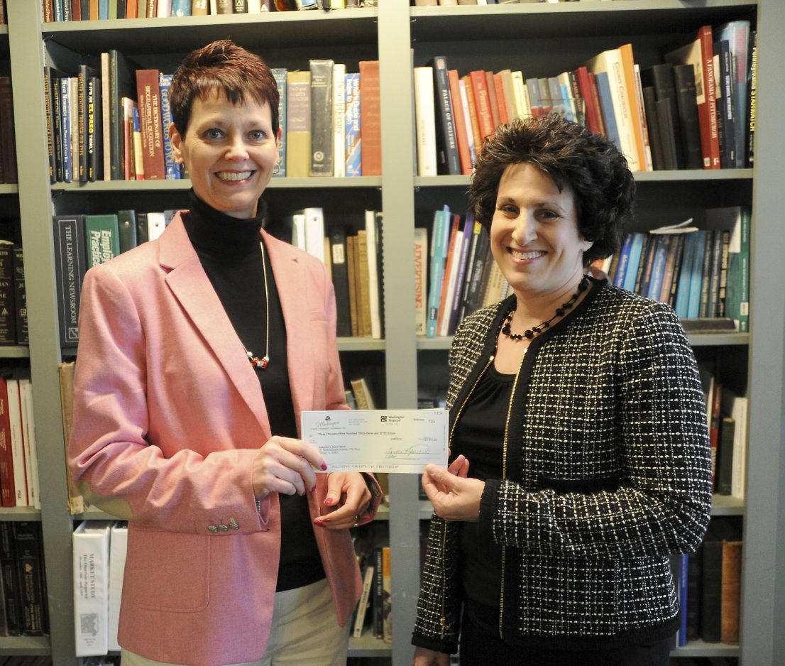 Checks totaling more than $25,000 were presented to Southwestern Pennsylvania Area Agency on Aging and the Alzheimer’s Association as part of the Observer-Reporter’s 2014 special reporting series on Alzheimer’s disease and dementia. Most of the money was generated through a purse auction fundraiser, held at The Meadows Casino in November. In the photo above, O-R Editor Liz Rogers, center, presents checks to Leslie Grenfell, left, executive director of the Area Agency on Aging, and Kathy Costantino, the agency’s Washington County supervisor. The agency received $15,749 for caregivers in Washington County and $4,800 for Greene County. Below, Rogers presents checks to Angela Grimm, vice president of development of the Alzheimer’s Association, Greater Pennsylvania Chapter. The checks – $3,937 for Washington County and $1,200 for Greene County – will be used for educational programming.