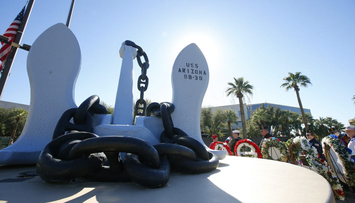 The event is being held on a Navy pier overlooking the USS Arizona Memorial. It straddles the battleship that sank nine minutes after being hit. It remains a gravesite for many of those killed.