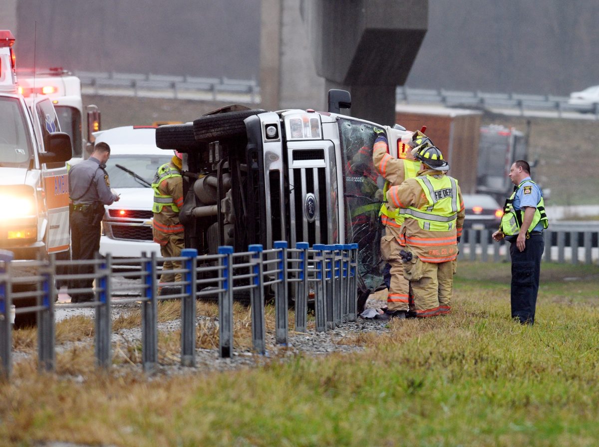 The accident occurred at the ramp from Interstate 70 to I-79 south, with the ambulance flipping on its side and coming to rest near the median.