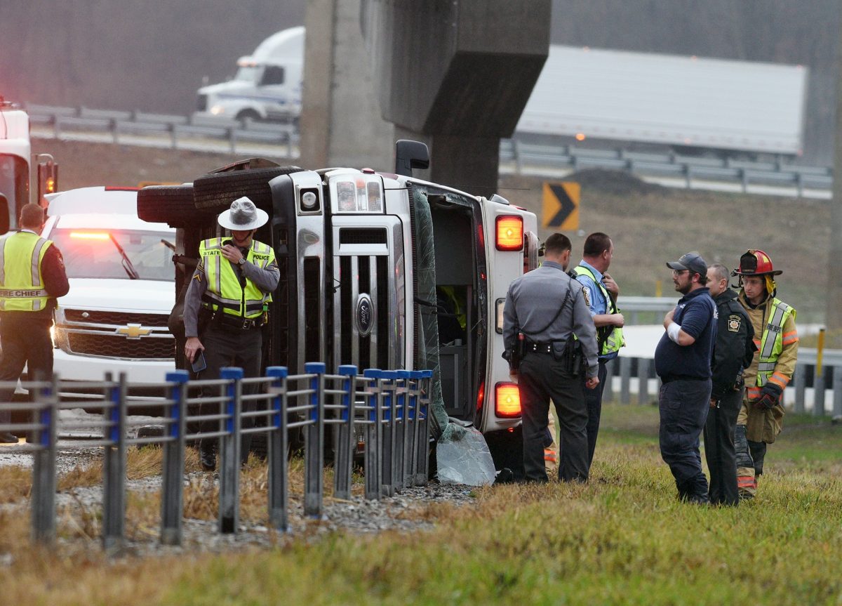 Trooper Frank Lewis said Grubb and Jones sustained minor injuries and were transported by ambulance to Washington Hospital. The patient, who remained strapped in the gurney, did not appear to sustain any further injuries. He was taken to Ruby Memorial Hospital.