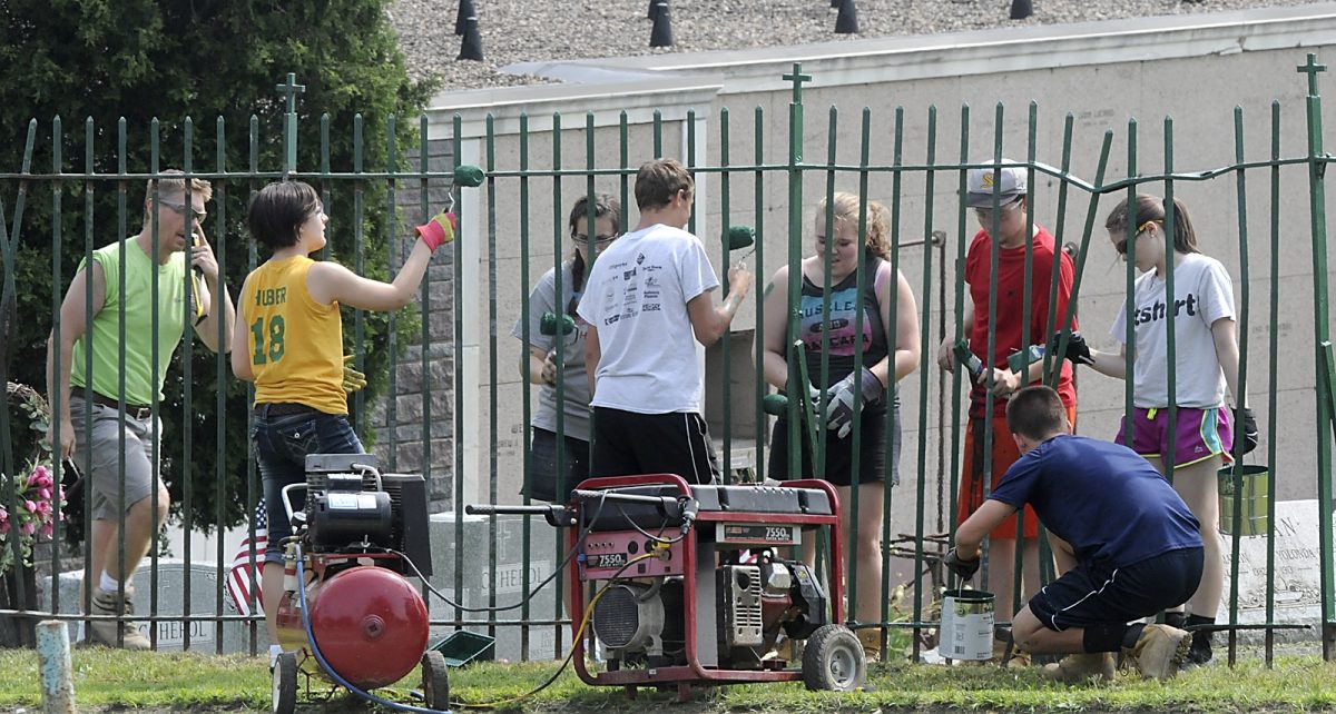 Jim McNutt/Observer-Reporter Bishop Canevin students Alexis Huber,15, left, and Maria Costantino,17, are two of many students painting an iron fence around Immaculate Coneption Cemetery along Locust Avenue in South Strabane Township Thursday. Twenty students, 15 parents, faculty and alumni joined together this summer to participate in the first school mission trip over six days, working on a variety of projects with Washington Habitat for Humanity.