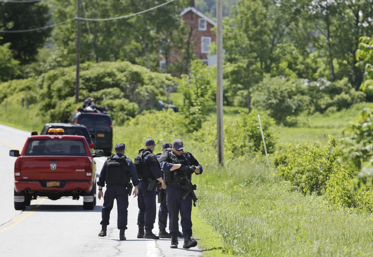 Dozens of officers with arms linked pushed through woods and fields in the town of Willsboro in an apparent attempt to drive their prey toward a road in a neighboring community. The road was lined with officers with rifles.