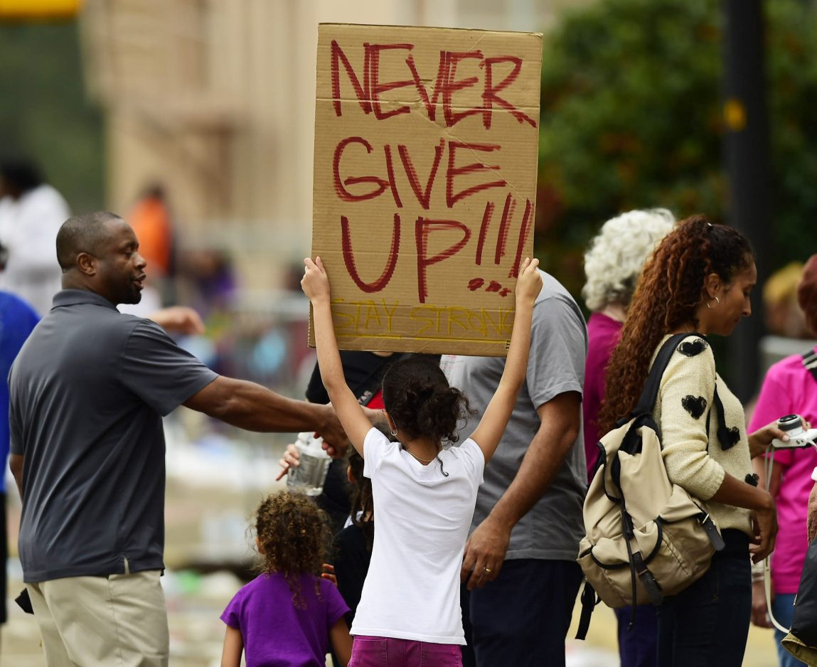 Some sang hymns and others held signs, such as “Black lives matter, all lives matter.”