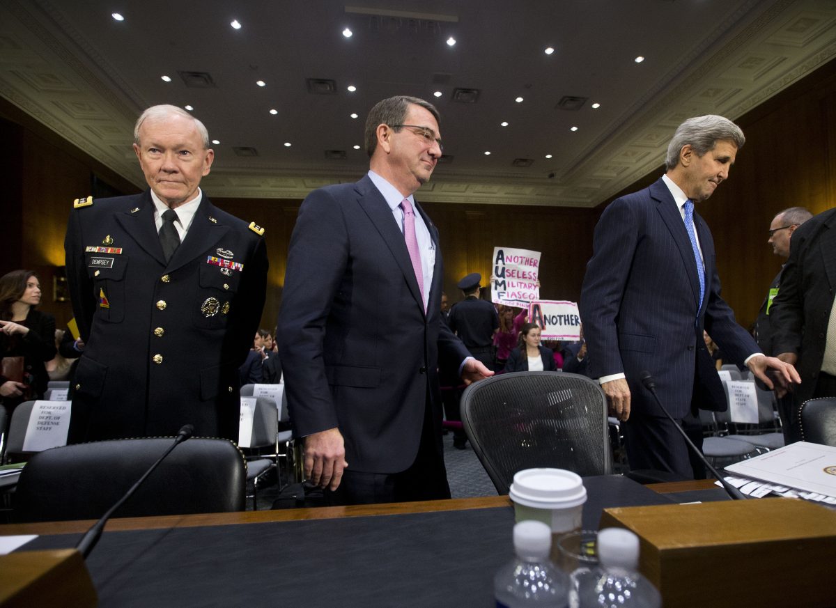 During Kerry’s testimony, an anti-war protester from the Code Pink shouted: “We’re tired of the endless war … the killing of innocent people.” Corker called for order. Kerry responded, asking, “Killing more innocent people? I wonder how our journalists who were beheaded and the (Jordanian) pilot, who was fighting for freedom, who was burned alive — what they would have to say to their efforts to protect innocent people?”