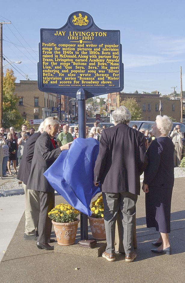 Nonetheless, Livingston and Evans persevered through the 1960s and even into the 1970s and 1980s, continuing to write songs for movies and television. It left precious little time for Livingston to make return trips to McDonald. In a 1987 interview with the Observer-Reporter, Livingston said he had been back just three times since he left for the University of Pennsylvania and all that followed. On the verge of an appearance with Evans to rechristen the Stanley Theater in downtown Pittsburgh as the Benedum Center, Livingston said, “When I lived there, everything was so dirty. McDonald was dirty because it was a coal town. Now, it’s so clean. I was so happy to see that happen.”