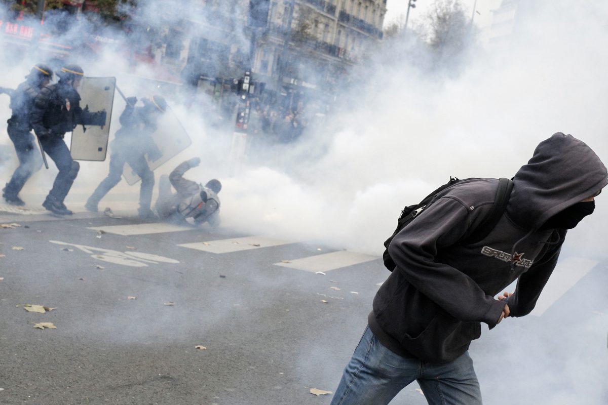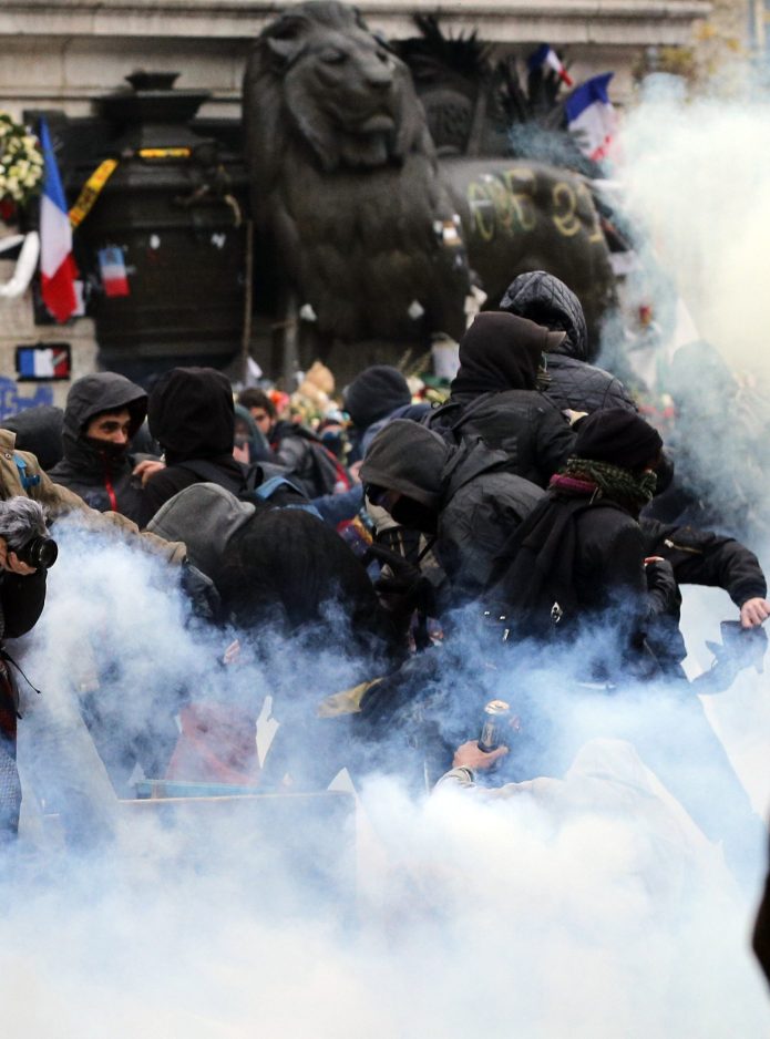 About 100 protesters found to have projectiles or other suspicious objects were detained after some demonstrations turned violent, said the Paris police chief, Michel Cadot. Thousands of other people joined peaceful demonstrations in other European capitals on Sunday.