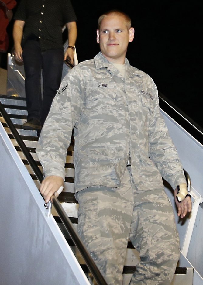 Stone suffered a cut thumb and other injuries in stopping the train attack. He is assigned to Travis Air Force Base in California.