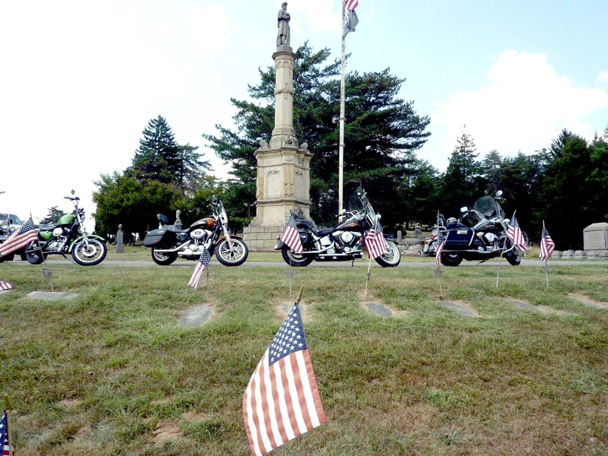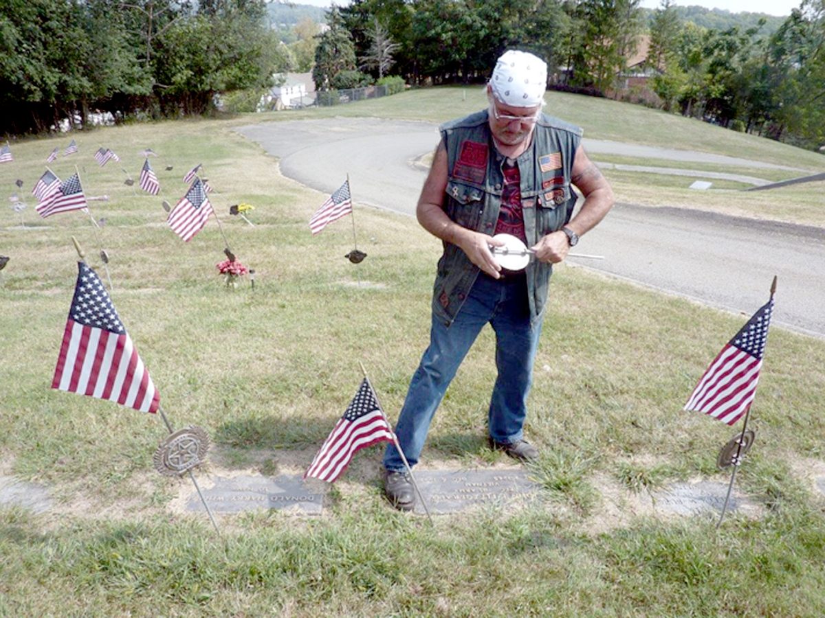 Pabian and five other Washington County members of the Second Brigade Motorcycle Club were at the cemetery Monday afternoon, replacing, straightening and installing flag holders, getting the Stars and Stripes off the ground and removing overgrowth from headstones.