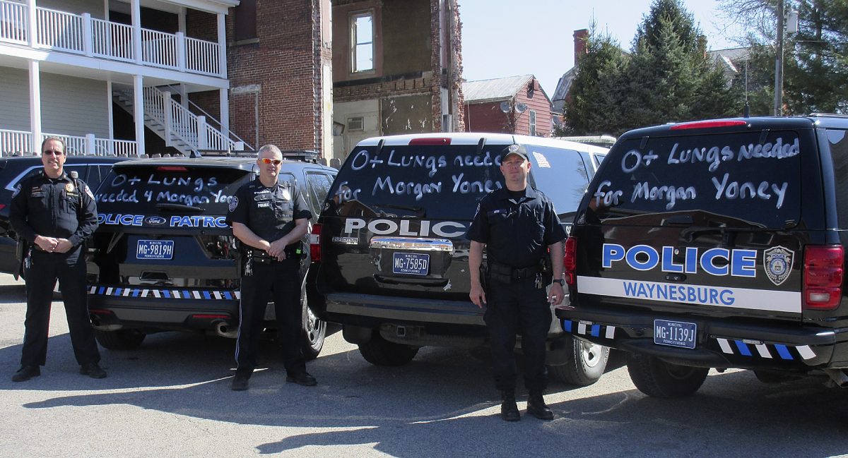 From left, Waynesburg police Chief Rob Toth and officers Tom Ankrom and Shawn Woods show support for Morgan Yoney, the 21-year-old Spraggs woman who has been waiting for a double-lung transplant for nearly two years. As a baby, Morgan was diagnosed with cystic fibrosis, a genetic disorder in which the lungs and digestive system are clogged with mucus, often resulting in liver and lung transplants. Ankrom, who has known Morgan since 2011, said the officers wrote “0+ lungs needed for Morgan Yoney” on the back of four police vehicles two weeks ago to show support. “People are always looking at police vehicles when they’re on the road, so I figured I’m going to turn it into a mobile billboard for Morgan,” Ankrom said.
