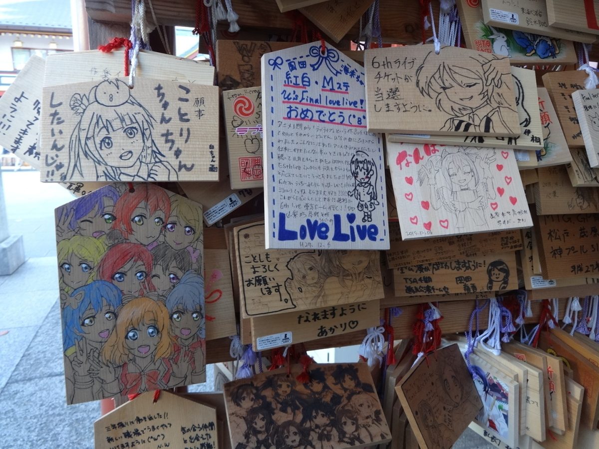 An easy place to experience seichijunrei is Kanda Shrine. It’s a short walk from the fan mecca of Akihabara, where anime fans typically go on their first trip to Tokyo. A central setting for the anime “Love Live! School Idol Project,” the shrine has capitalized on this connection with various items for sale. Prayer plaques, which you’ll see at other shrines illustrated with seasonal motifs or religious imagery, here have illustrations of characters. And fans don’t settle for just that: Many add their own drawings to the blank side where people write their prayers.