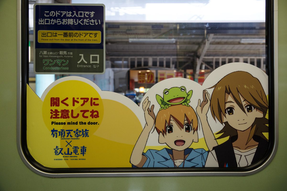 Even fantasy series are often set in precise real locations. Kyoto is also the setting for “Uchoten Kazoku” (released in English as “The Eccentric Family”), about a family of mythological shape-shifting animals called tanuki. Their fantastic escapades are set in real Kyoto locations, and fans may visit the shrine where they lived in their animal form and a billiard parlor they frequented when disguised as humans. One episode included a surreal fantasy trip on a car from the Eizan Electric Railway, which in real life regularly does tie-ins with anime series, and at one point used the characters on signs reminding riders to watch the closing doors.