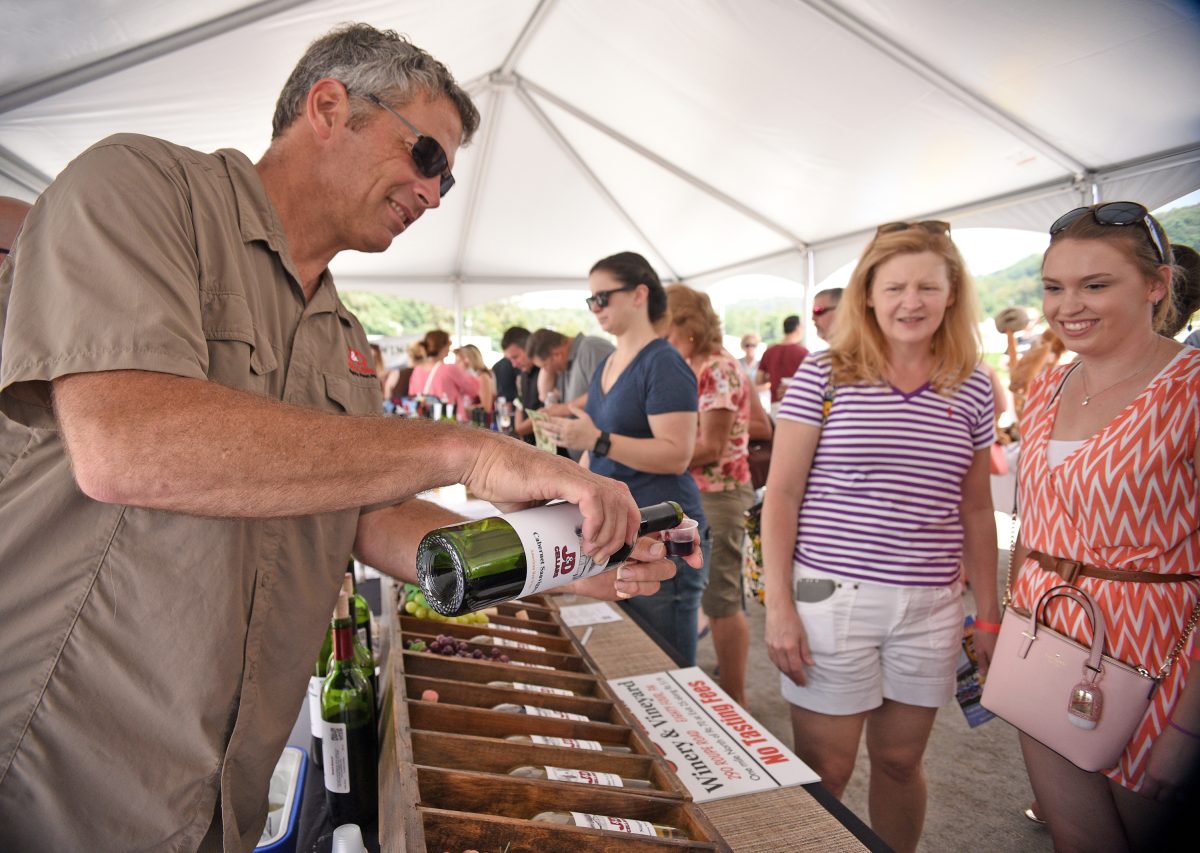 John Husk with J&D Cellars pours a sample of wine for Hannah Cannon, right, and Peggy Pust, both of Waynesburg, at the 2016 Corks & Kegs Festival at The Meadows Racetrack & Casino Saturday.