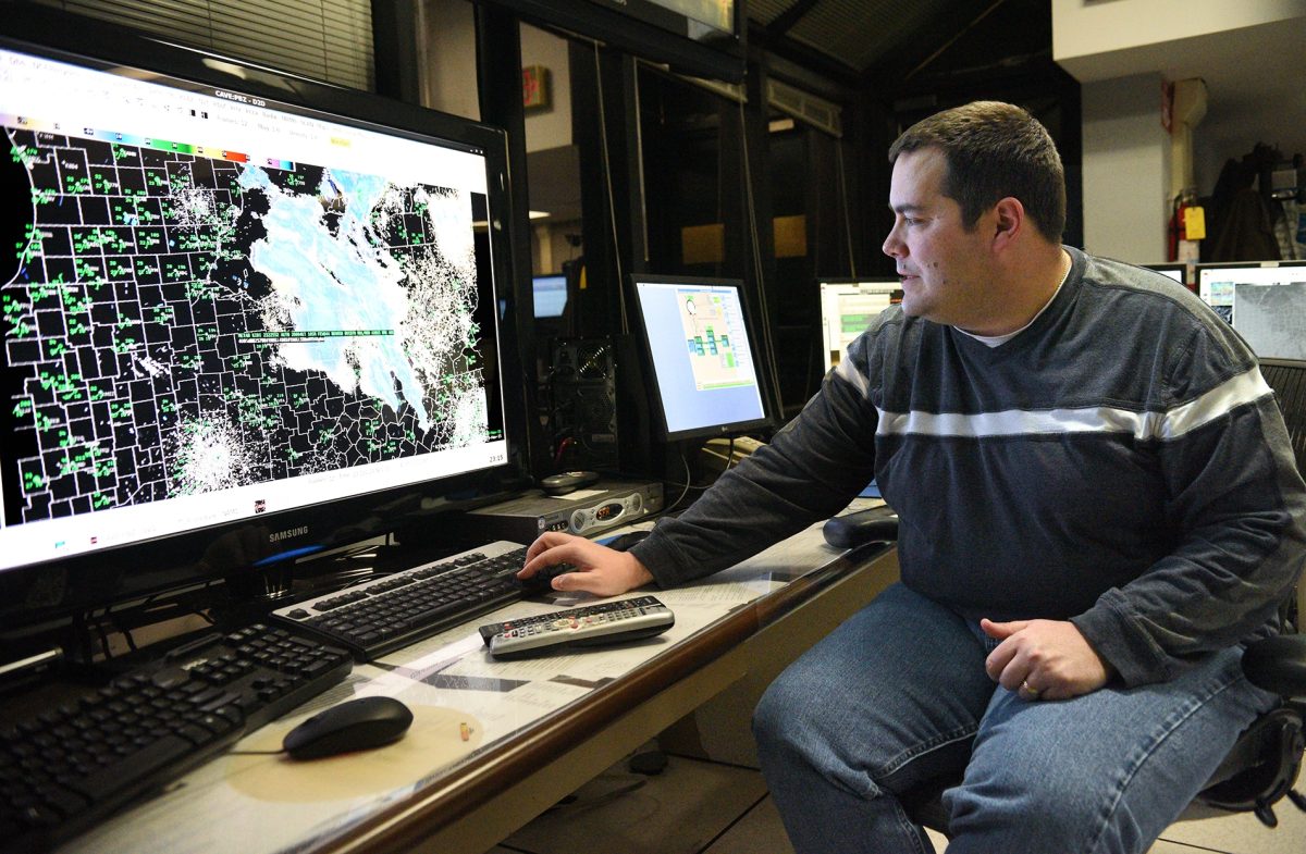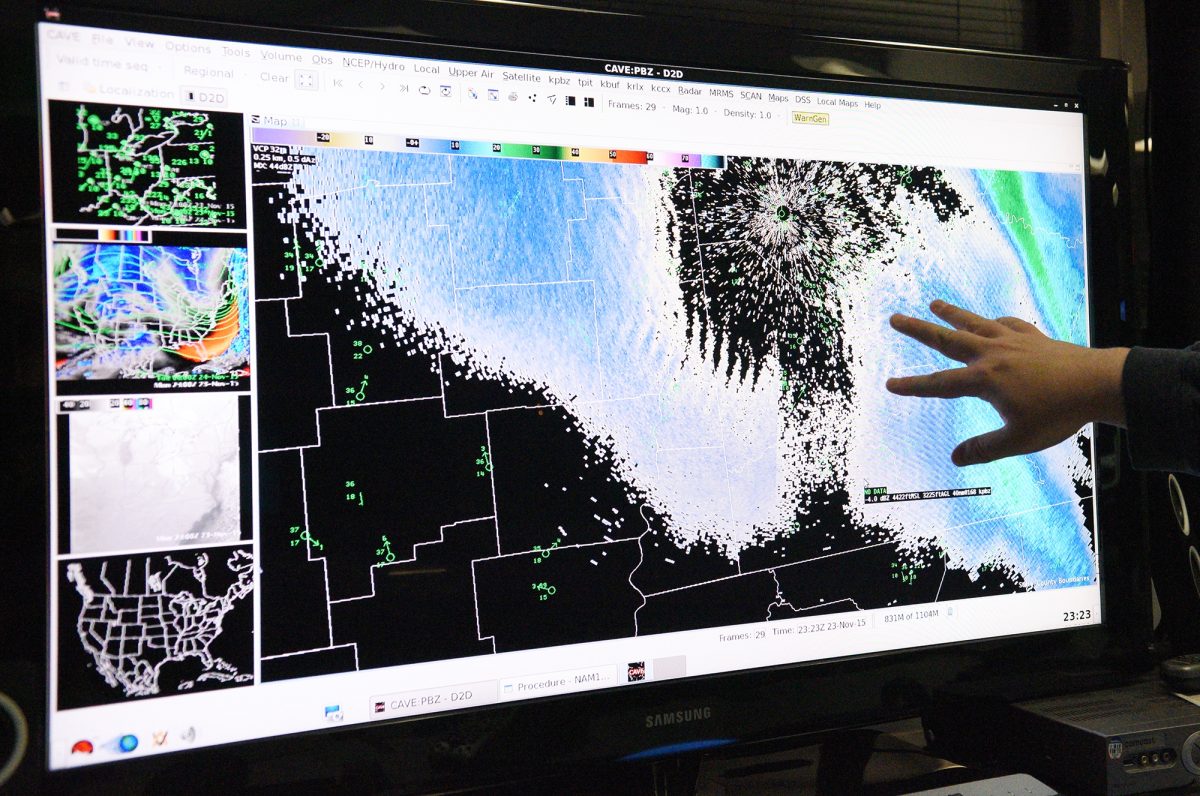 Chris Leonardi, a meteorologist with the weather service for 21 years, explained patterns and radar while studying large monitors displaying Washington and Greene counties.