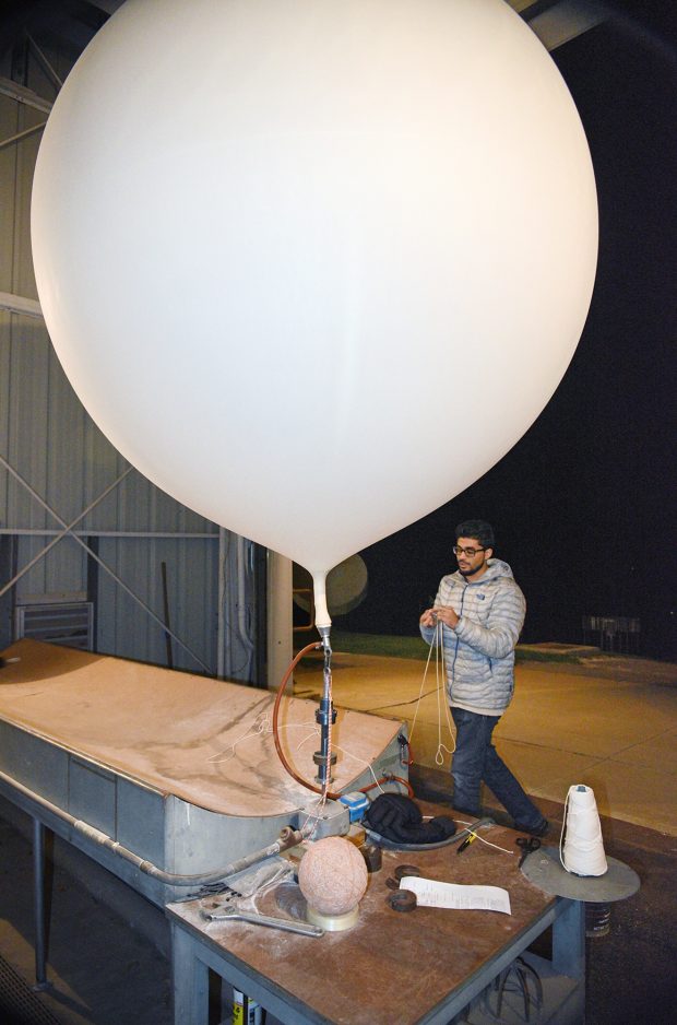 The balloon is attached to a radiosonde, a small white box that measures and transmits air pressure, temperature, humidity, wind direction and speed. The data is sent to a computer in the well-equipped basement office, where Gangat and other meteorologists use the information to predict changes in the atmosphere and subsequent weather.