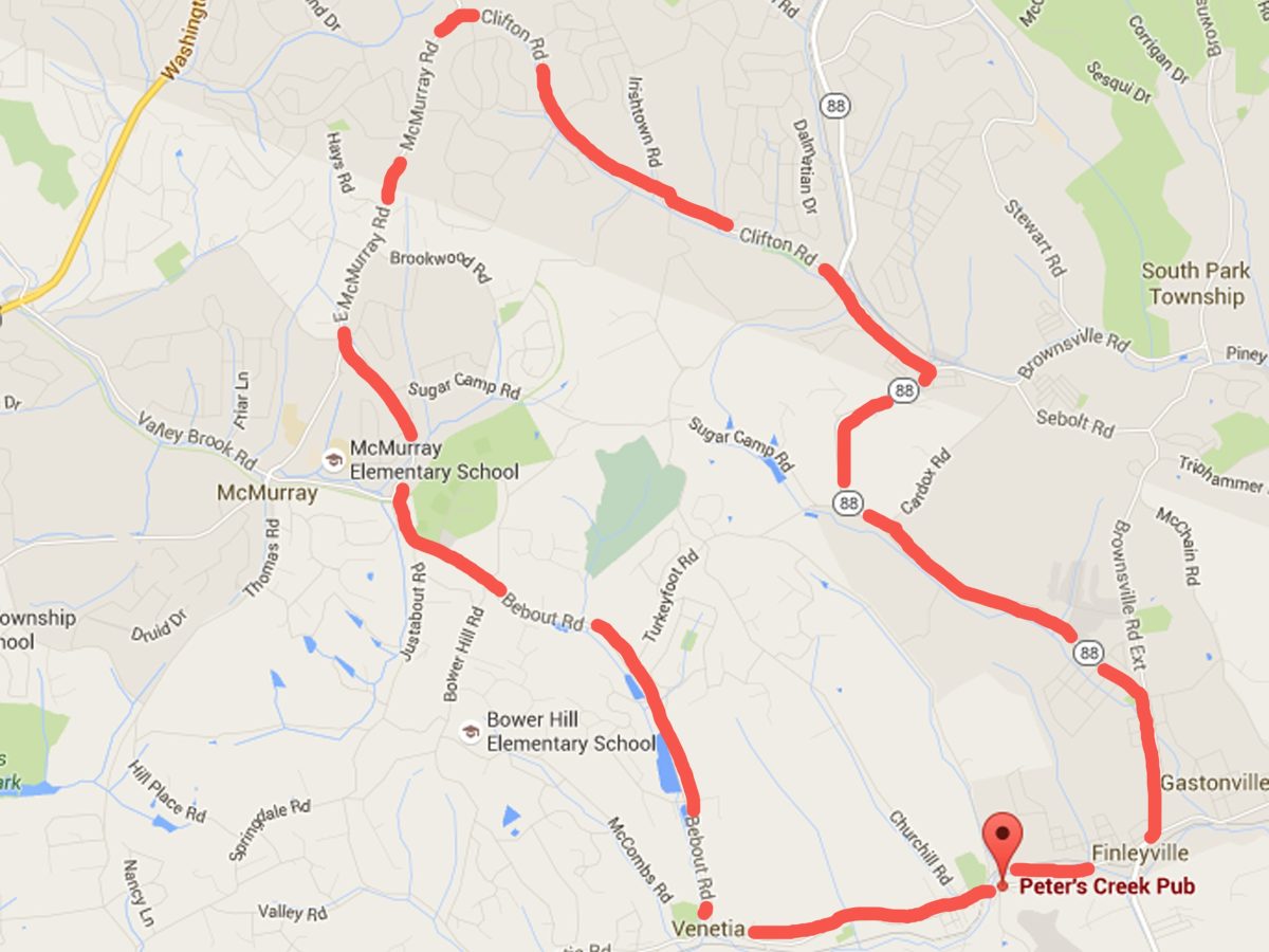Starting at the bridge and heading west into Peters, motorists are advised to follow Venetia Road to Bebout Road, and then to East McMurray into Allegheny County, where East McMurray becomes McMurray Road. Drivers can turn onto Clifton Road, proceed to Library Road (Route 88) to re-enter Washington County into Union Township. In Finleyville, motorists make a right onto Washington Avenue, which becomes Rankintown Road.