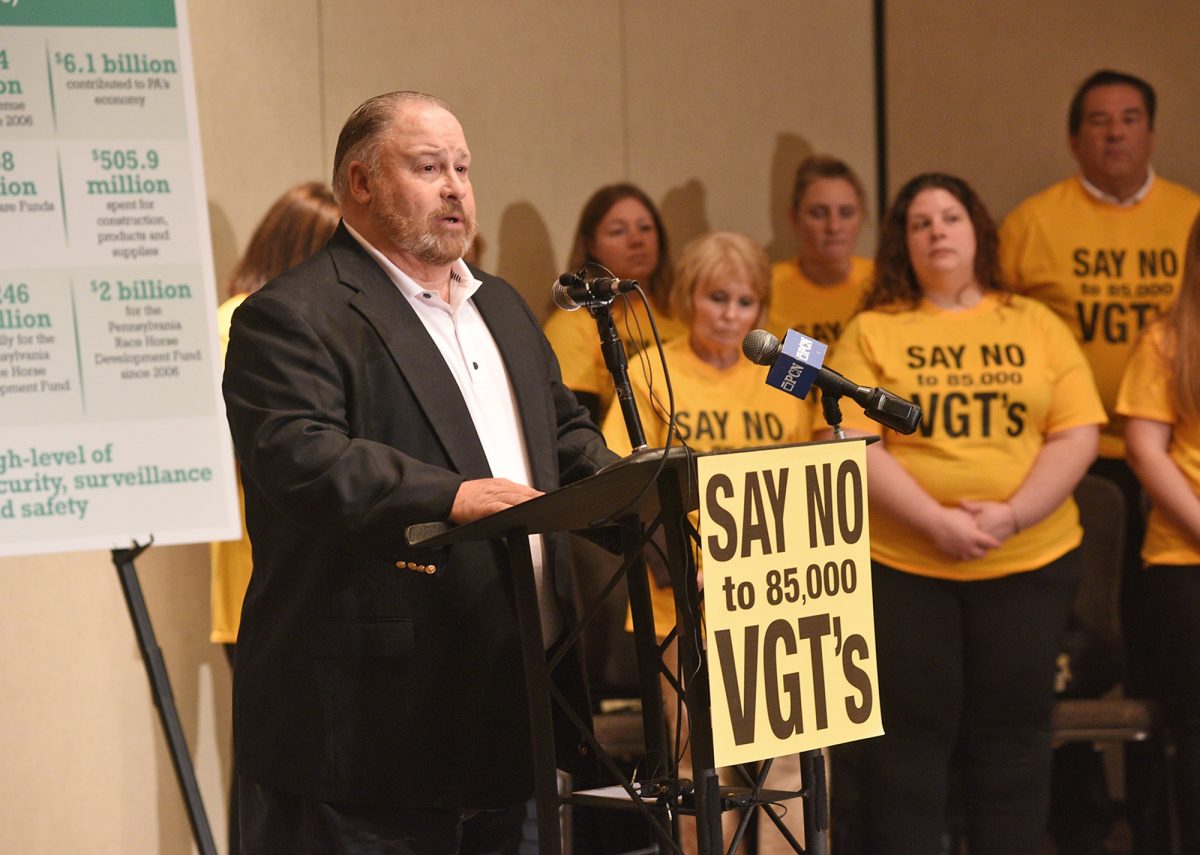 The speakers at Thursday’s event were surrounded by about 30 Meadows Casino employees wearing yellow T-shirts stating, “Say no to 85,000 VGTs.”