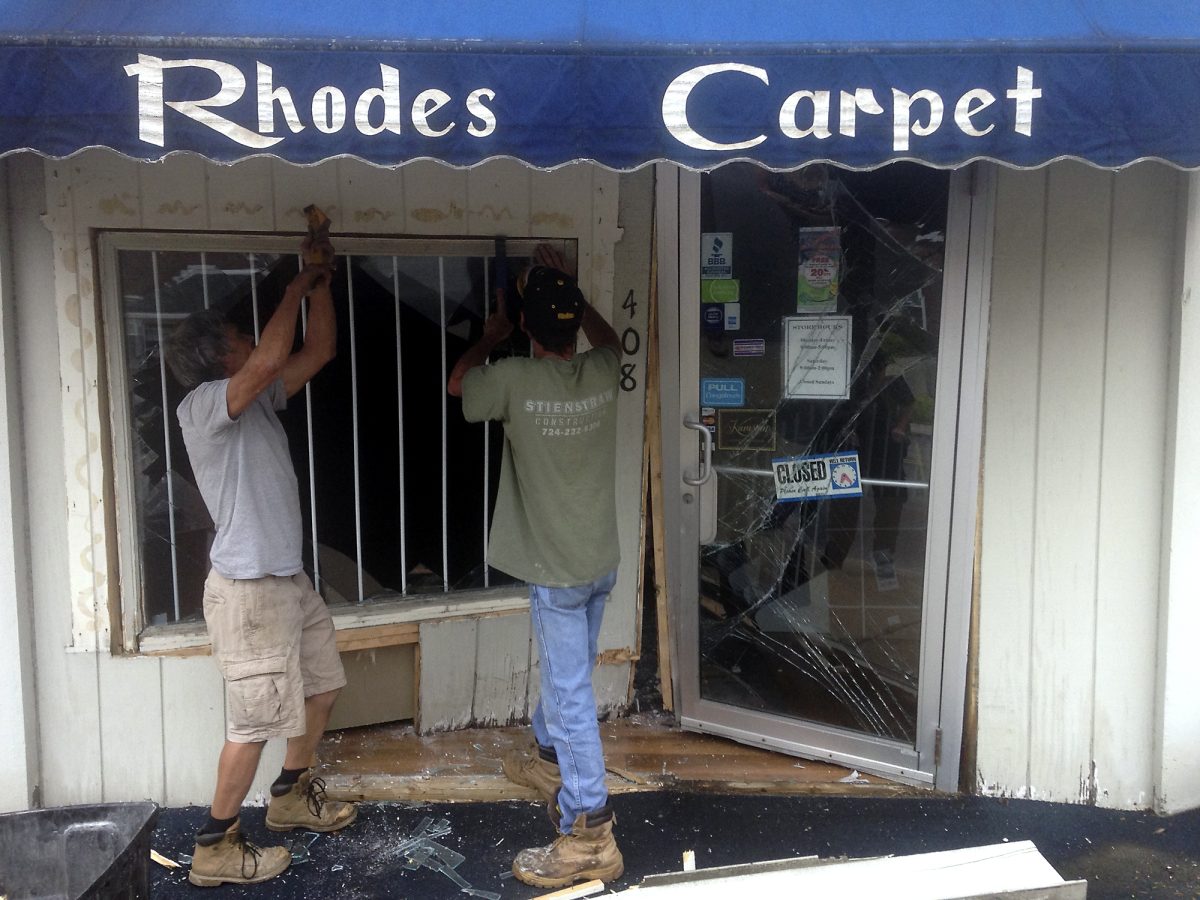 Workers repair the damaged caused Friday morning when a hit-and-run driver struck the front of Rhodes Carpet on South Main Street in Washington.