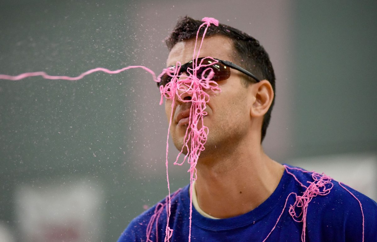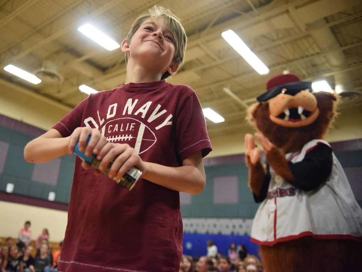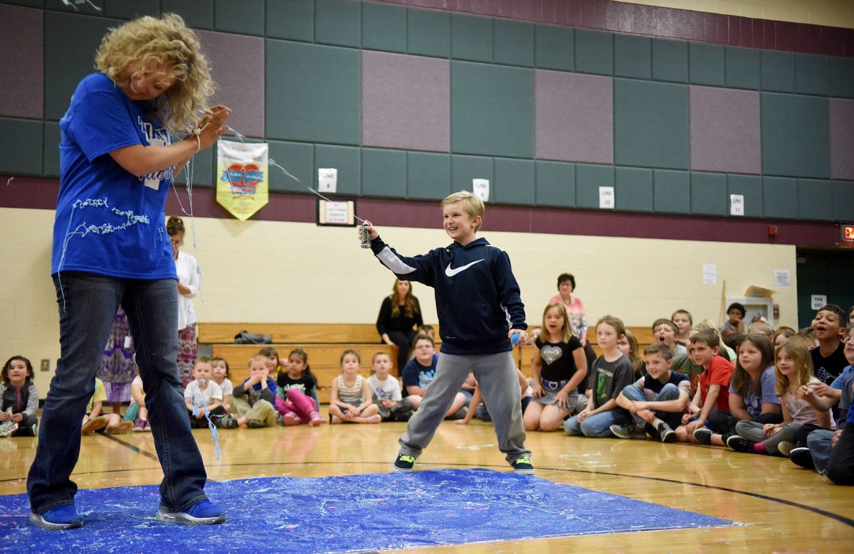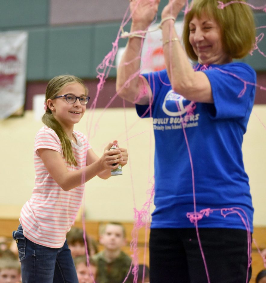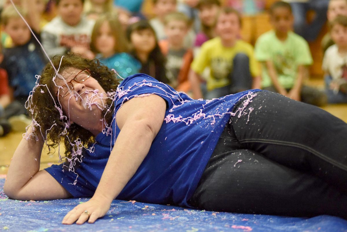 Students at Trinity North Elementary School had the opportunity Thursday to silly string their teachers after exceeding their goal of reading 7,700 books in one month. The students read 8,140 books.