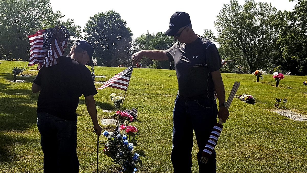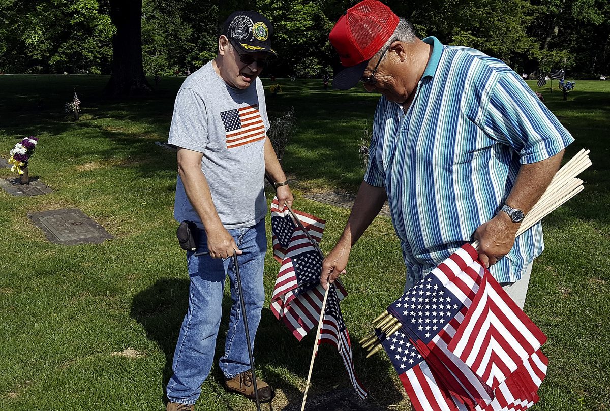 Various veterans’ groups and Jefferson-Morgan students gathered Friday morning at Greene County Memorial Park to place flags on the more than 1,600 veterans’ graves ahead of the services planned at the cemetery during the Memorial Day holiday. At top, Roy Lemley, right, and Richard Ketchem, both members of the Patriot’s Dreams Riding Association, spent time working on one veteran’s grave. At left, Ron Shaffer, left, and Robert Harry, members of the American Legion Post 954 in Jefferson, placed flags on headstones in the veterans areas of the cemetery.